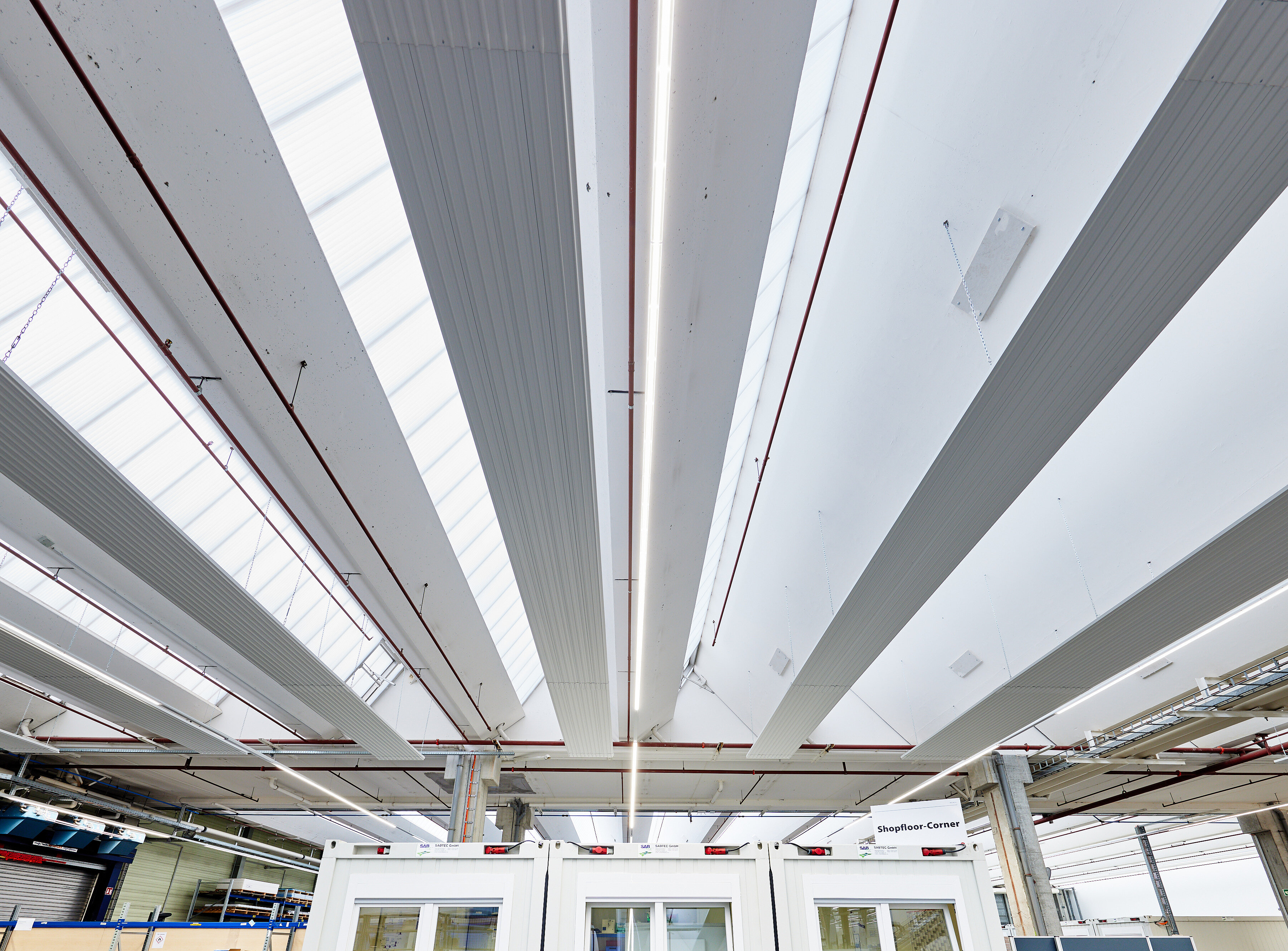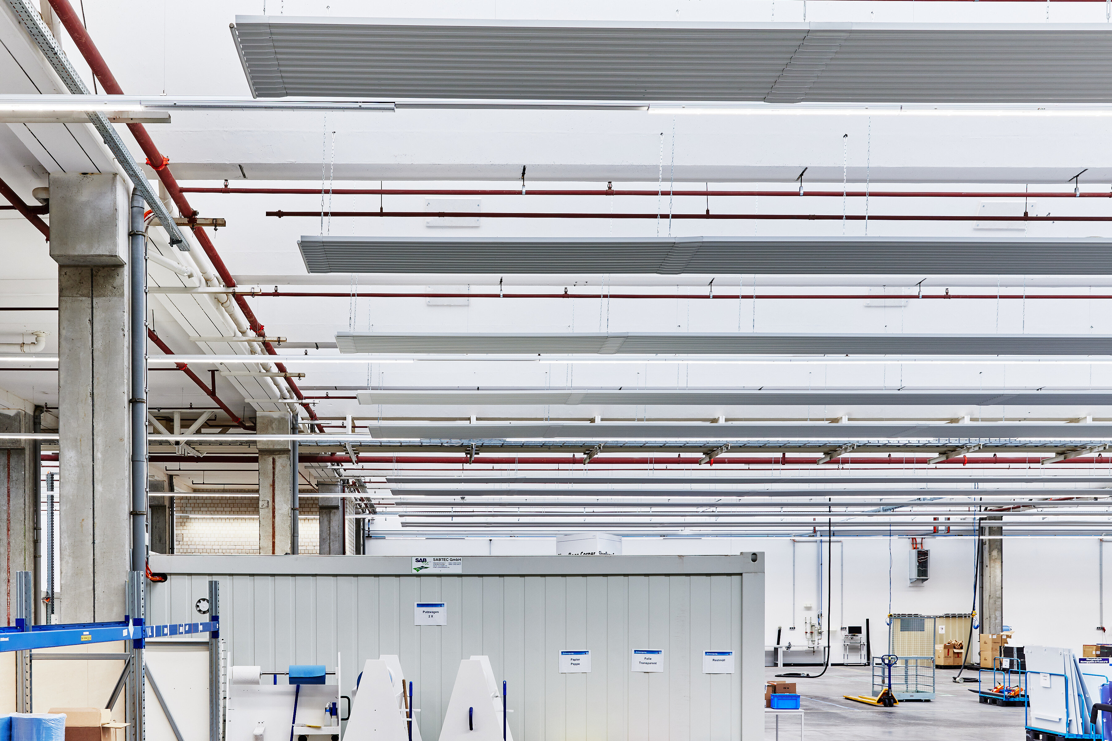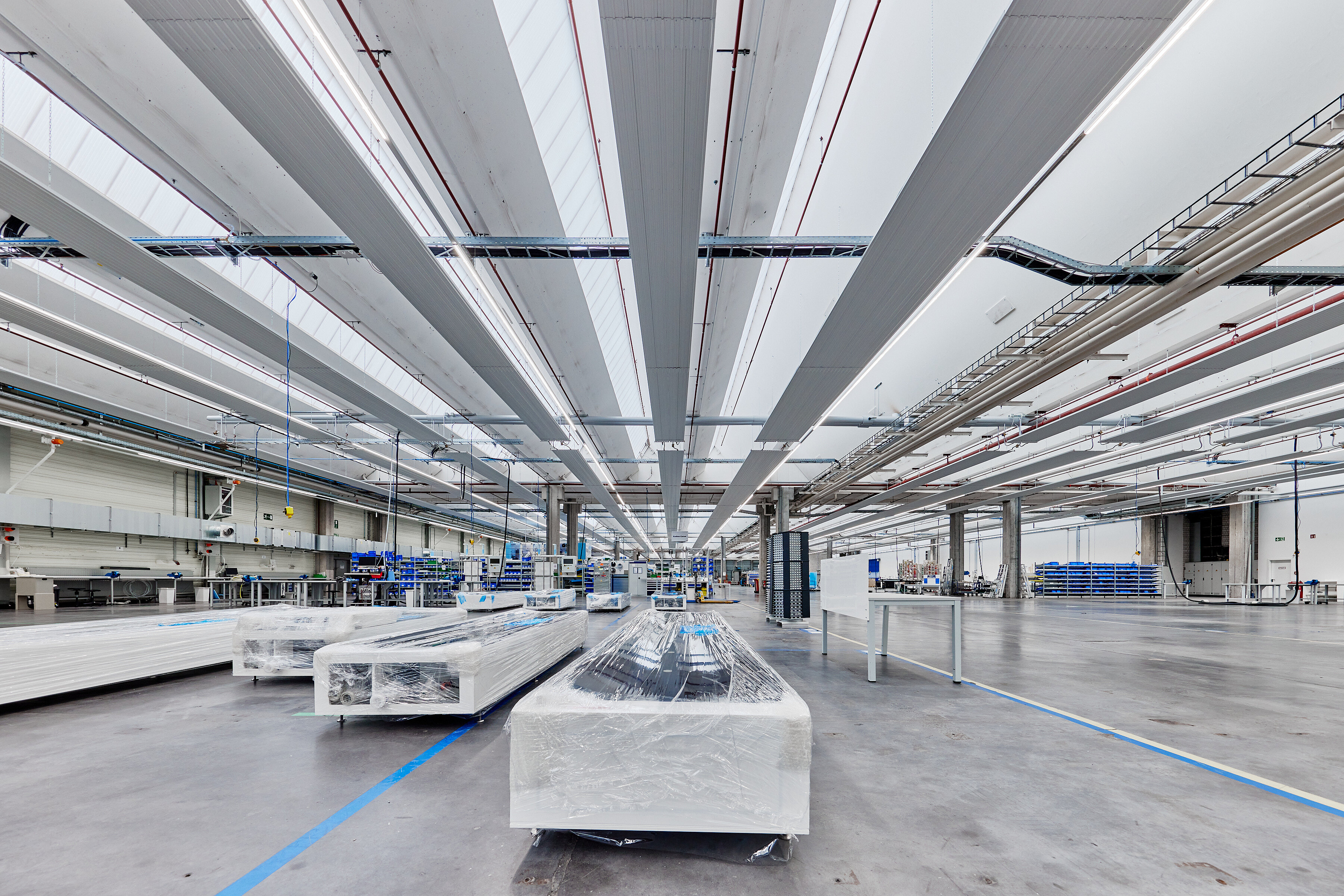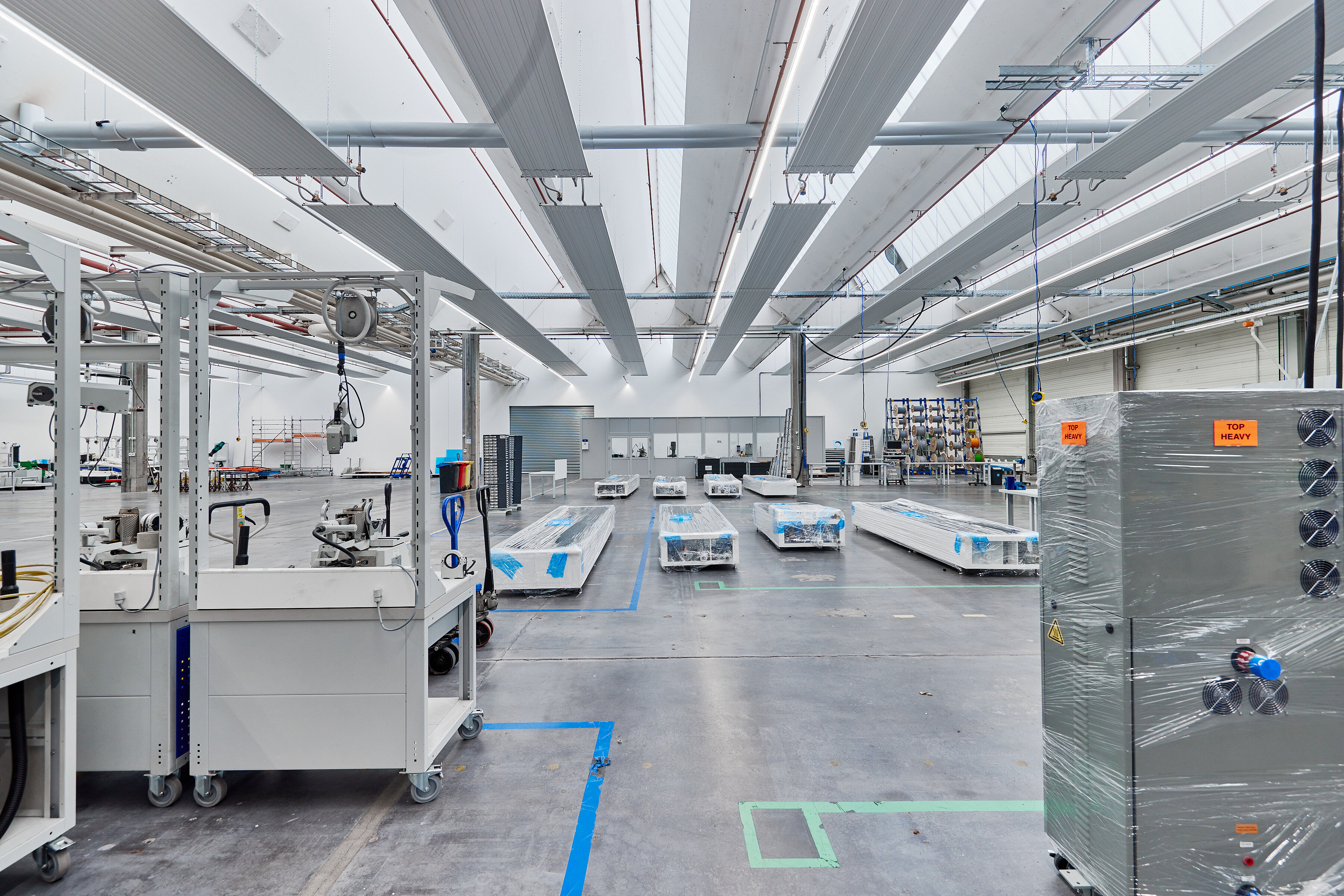 Neben der Installation des neuen Heizsystems fielen eine ganze Reihe weiterer Aufgaben an, die parallel und unter dem großen zeitlichen Druck zu erledigen waren. Zusätzlich zur Beseitigung der Überreste des Vormieters galt es, neue Zwischenwände zu errichten, Elektroleitungen zu verlegen, sowie für die Verfügbarkeit von Druckluft und Wasser zu sorgen. „Ohne die optimale Verzahnung aller Gewerke, die parallel in der Großhalle an der Fertigstellung arbeiteten, wäre der Abschluss der Sanierung niemals rechtzeitig möglich gewesen“, stellt Michael Schönfelder fest und fügt hinzu: „Während den Arbeiten in der Produktionshalle kam seitens RENA Technologies noch der Wunsch nach einem Lagerplatz für die fertiggestellten Anlagen auf. Dafür wurde kurzerhand eine angrenzende Halle mit knapp 3.000 m2 angemietet, wo nochmals 13 Deckenstrahlplatten Zehnder ZFP mit einer Gesamtlänge aller Bänder von insgesamt 770 Laufmetern installiert wurden. Der Zeitplan geriet dabei zu keiner Zeit in Gefahr, was zu einem großen Teil an der Flexibilität liegt, die Zehnder auch hier wieder einmal bewiesen hat“.