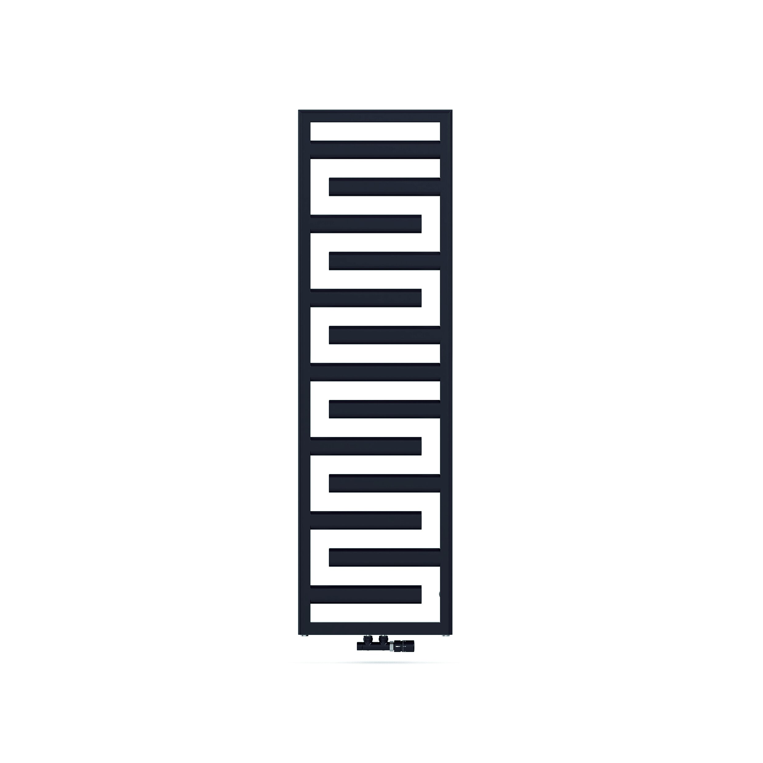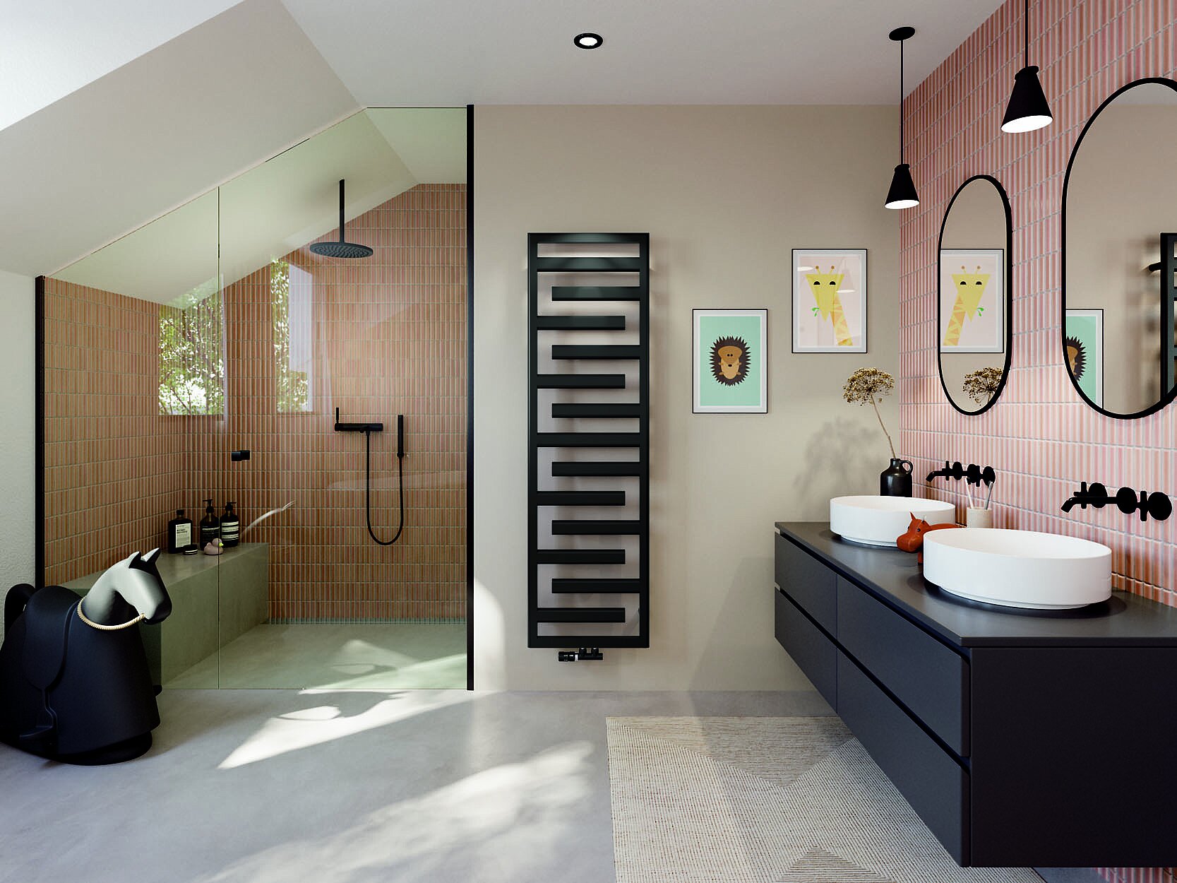 Mit dem Badheizkörper Zehnder Tetris wurde der Leitsatz der Studio Collection „form follows function“ wieder einmal eindrucksvoll unter Beweis gestellt. So besteht das formschöne Design aus vertikal angeordneten, nach außen abgerundeten D-Profilrohren sowie versetzt angeordneten Flachovalrohren. Die dadurch entstehenden großzügigen Aussparungen bieten Platz zum bequemen Aufhängen von mehreren Badetüchern. Seitliche und am oberen Rand angeordnete D-Profilrohre sowie ein Vierkantrohr unten bilden den funktionalen Rahmen des Design-Heizkörpers.