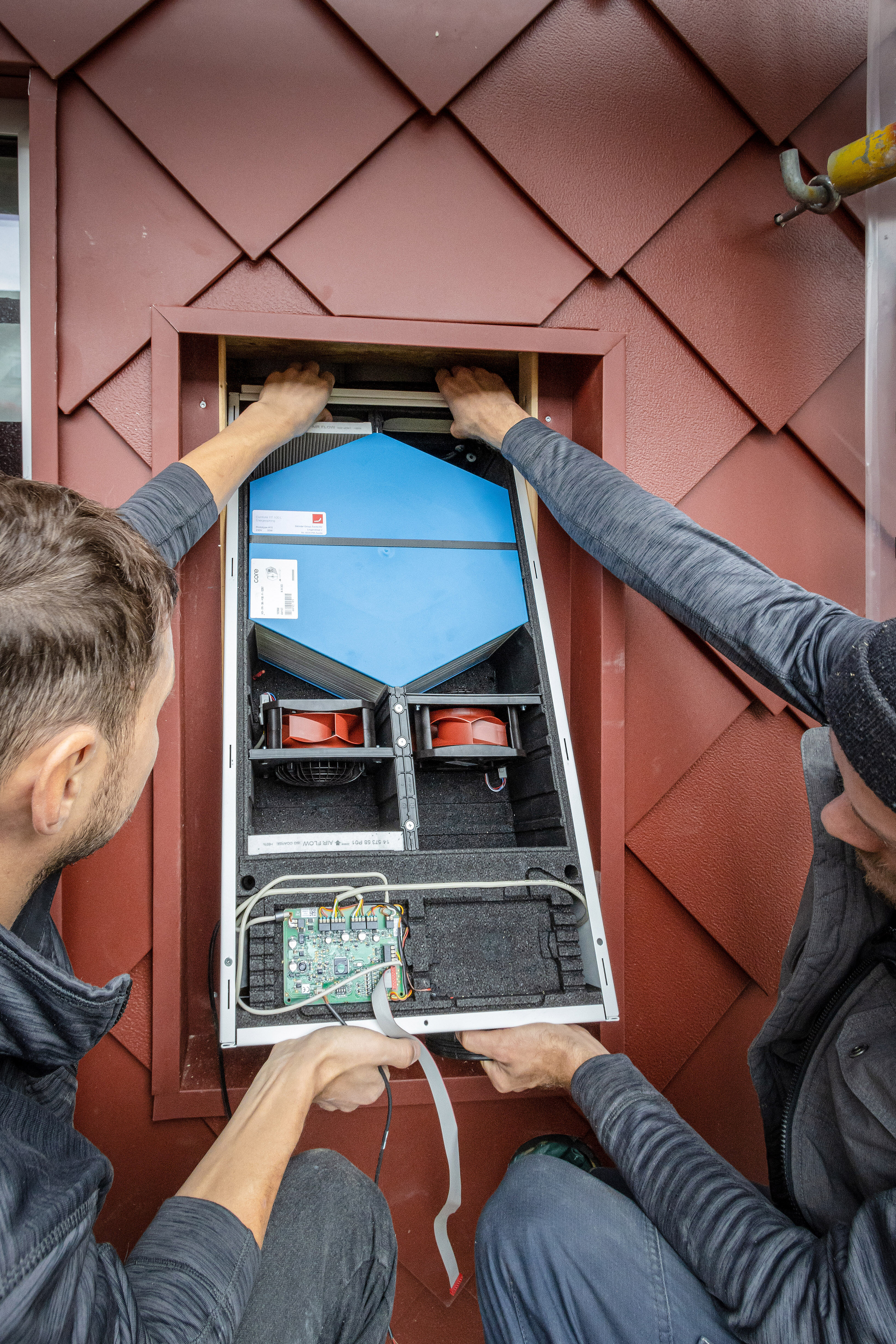 Der Wohnungsgenossenschaft lag nicht nur am Herzen, dass die Mietparteien keiner finanziellen Mehrbelastung ausgesetzt werden, sondern sogar während des kompletten Sanierungszeitraums in ihren Wohnungen bleiben können. Für die beteiligten Unternehmen war das jedoch mehr Motivation als Einschränkung: Um den operativen Eingriff in die Gebäudehülle so wenig invasiv wie möglich zu gestalten, entschied man sich dazu, die neue Fassade mit einer Dämmung von ca. 45 cm und inklusive vormontierter Fenster und Türen komplett vorzufertigen und im nächsten Schritt damit das Bestandsgebäude einzukleiden. Diese Vorgehensweise erforderte auch, dass die Lüftungsgeräte sowie die Luftverteilung bereits im Vorhinein in die neue Fassade integriert werden. „Dafür haben wir in der Werkstatt von Korona Holzbau gemeinsam an der optimalen Lösung getüftelt“, berichtet Marcus Bieleit. Zur Veranschaulichung wurde dort erst mit Modellen gearbeitet, bis die richtigen Maße und die perfekte Auslegung feststanden. Dann fertigte das Holzbauunternehmen die Elemente der neuen Außenfassade und setzte dabei bereits bauseits die Lüftungskomponenten ein, sodass auf der Baustelle lediglich Kernlochbohrungen und finale Installationsschritte vorgenommen werden mussten.