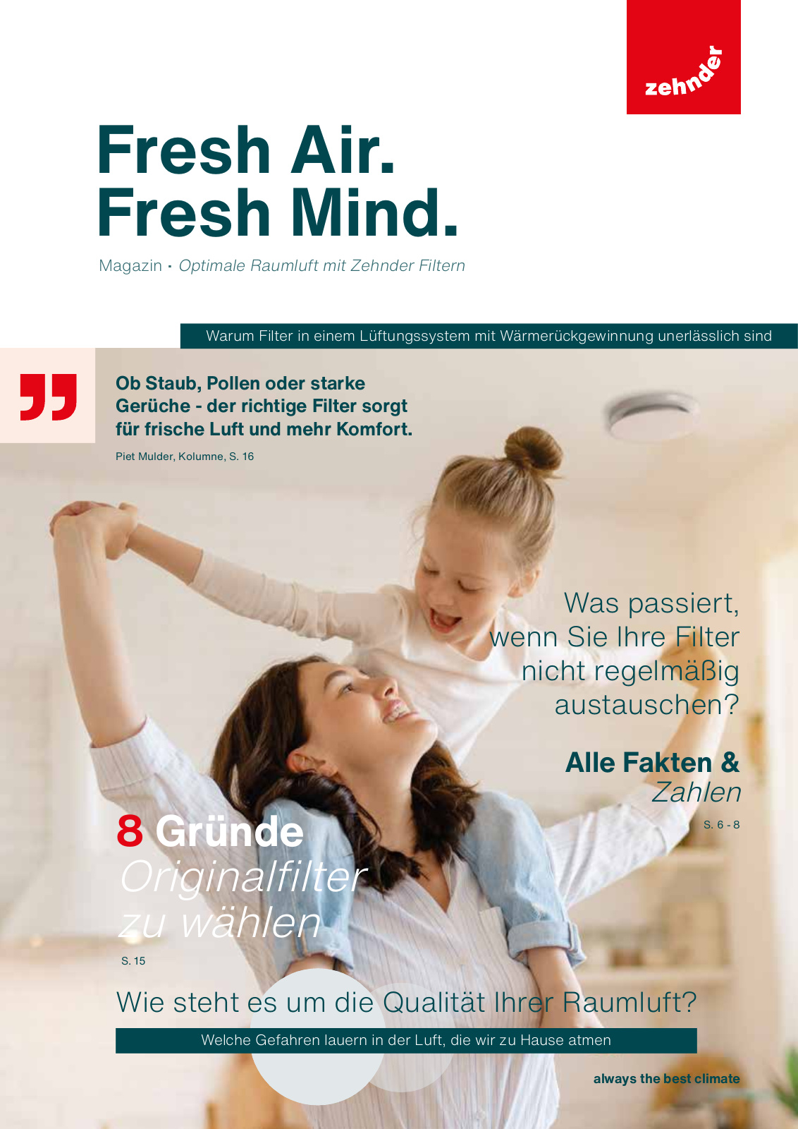 Zehnder Originalfilter stehen für höchste Qualität und Sicherheit. Sie sind optimal auf die jeweiligen Zehnder Komfort-Lüftungsgeräte abgestimmt und gewährleisten eine dauerhaft hohe Filterleistung – für gesunde Raumluft, leisen Betrieb und maximale Energieeffizienz. Wie wichtig die richtige Filterwahl und deren regelmäßige Wartung für ein gesundes Zuhause sind, zeigt Zehnder in seine neuen Filtermagazin –https://zgde.gmbh/filtermagazin mit spannenden Hintergrundinformationen, Expertentipps und praktischen Empfehlungen rund um das Thema Luftqualität.