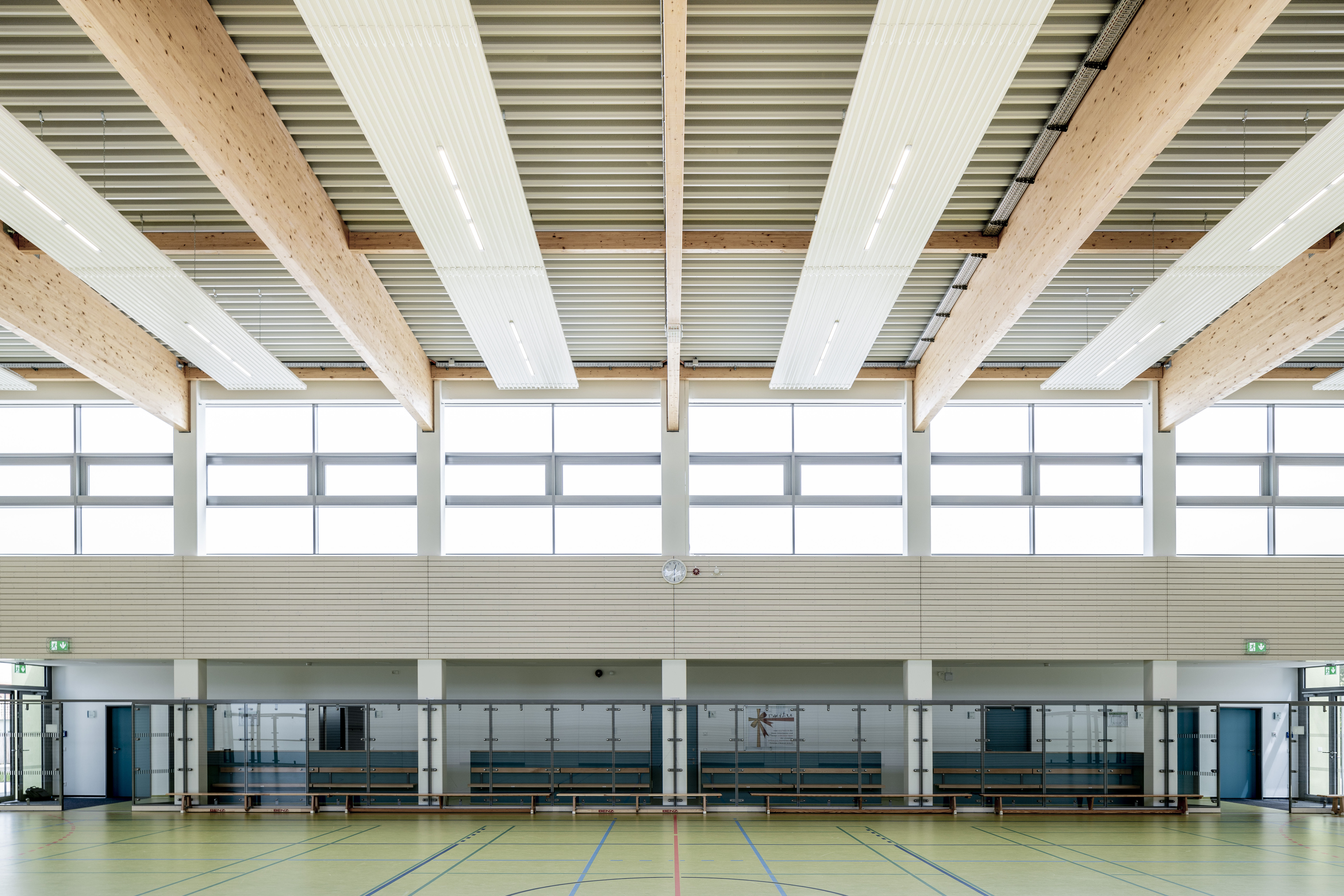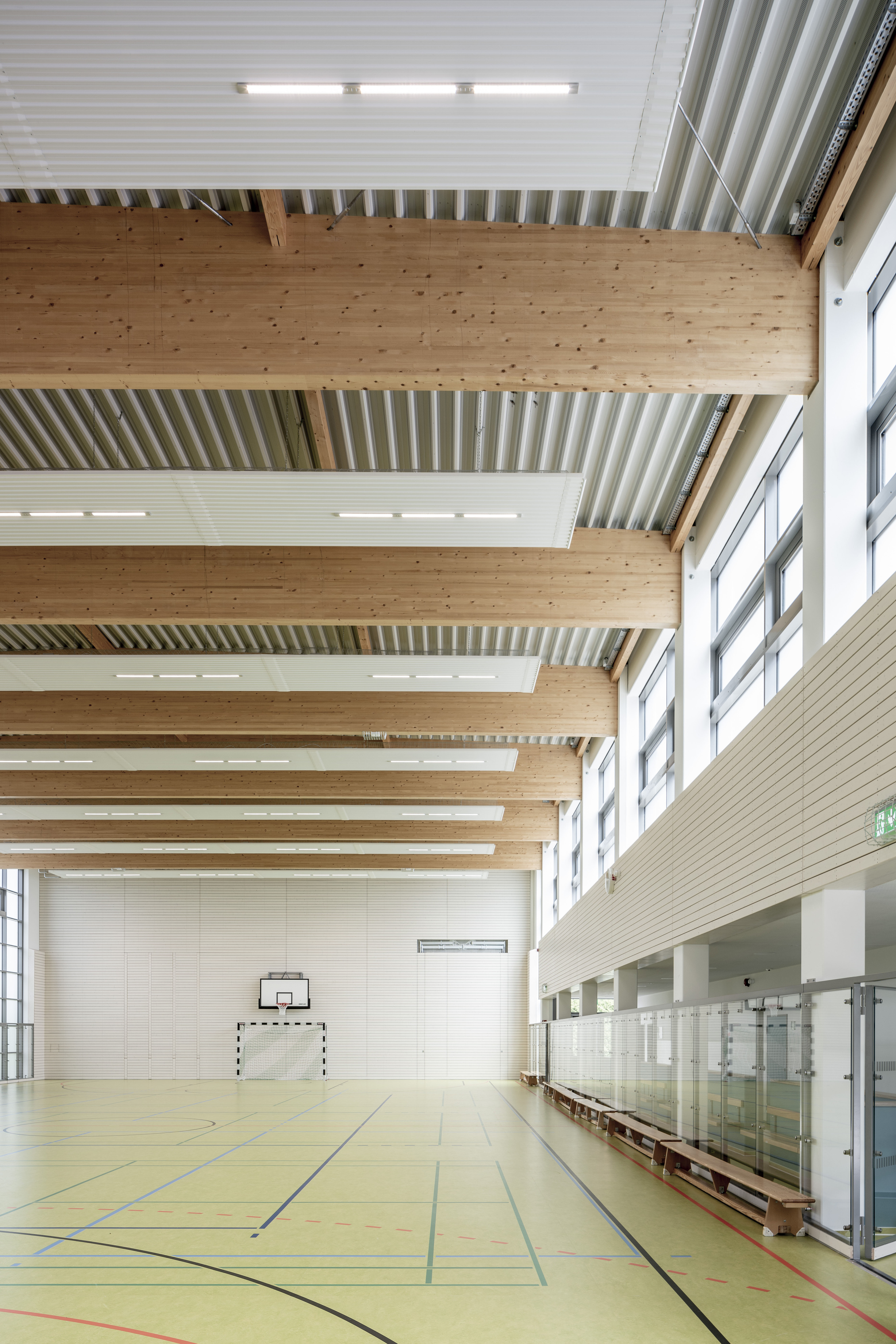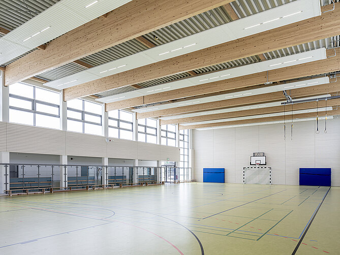 Das Wohlergehen und der Komfort der Nutzer lag den Verantwortlichen bei der Hallenkonzeption besonders am Herzen: „Wir haben uns intensiv mit den Sportlerinnen und Sportlern auseinandergesetzt und uns so gut wie möglich an deren Bedürfnissen orientiert“, gibt Architekt Strauß zu Protokoll. Neben einem sehr hohen Anspruch an die Ausleuchtung der Turnhalle in den Abend- und Nachtstunden war man auch auf der Suche nach einem geeigneten Heizsystem und orientierte sich dabei an vergleichbaren Sportstätten im Bundesgebiet: „Die Nutzung von Deckenstrahlplatten zur Turnhallenklimatisierung liegt definitiv im Trend, besonders in den ‚alten Bundesländern‘ und das hat uns inspiriert“, berichtet Architekt Strauß und fügt hinzu: „Wir haben uns im Vorfeld zahlreiche Turnhallen angesehen. Auf die Frage nach dem Heizsystem wurde uns mehrheitlich signalisiert, dass Deckenstrahlplatten hier ein bewährtes System sind und das hat uns letztendlich überzeugt.“