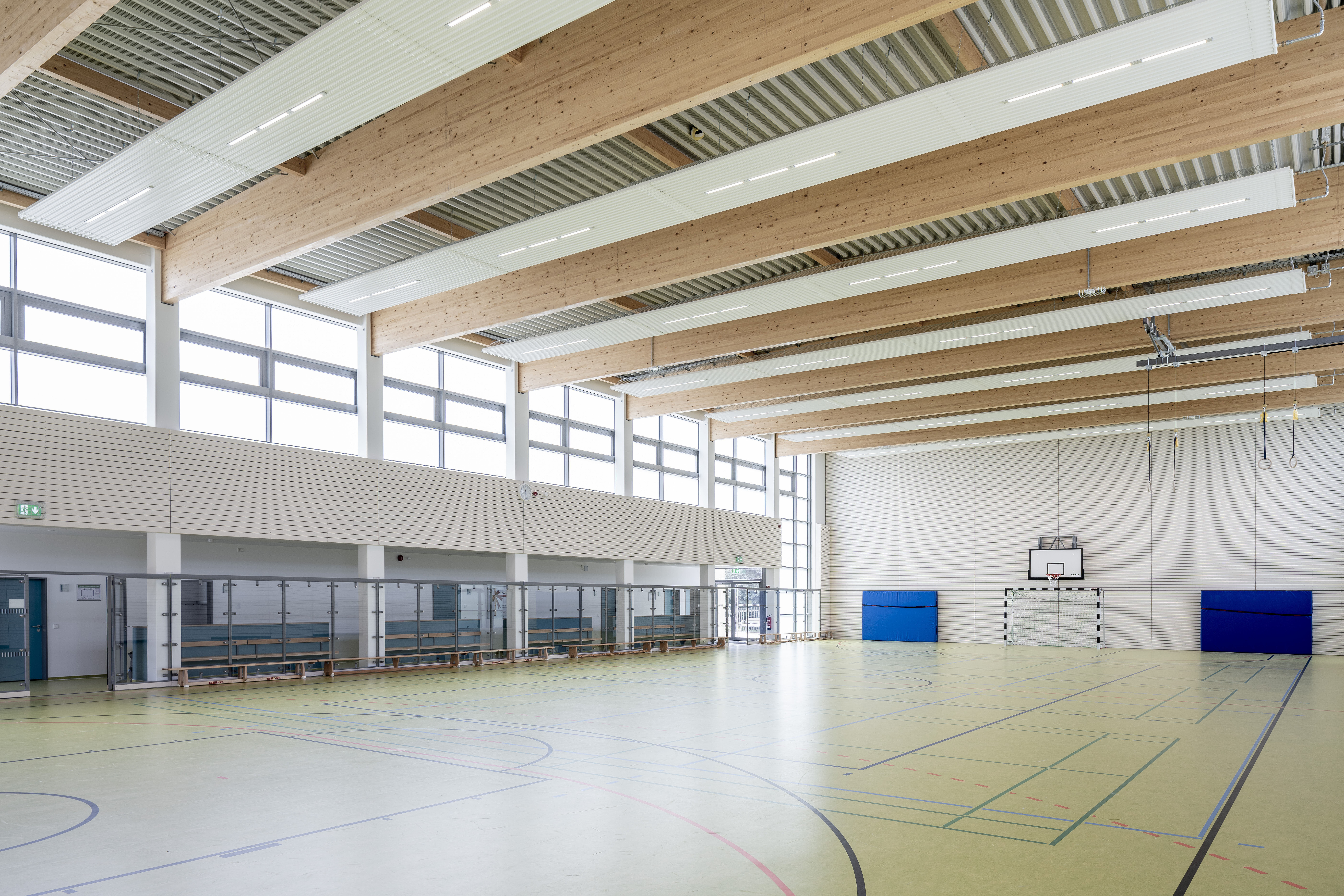 Notwendig war der Neubau geworden, da die alte Turnhalle, welche direkt nebenan auf der heutigen Außensportfläche stand, nach fast 50jährigem Bestehen schlicht und ergreifend ausgedient hatte. „Dort hat sich über die Jahre ein ziemlicher Sanierungsrückstau angesammelt und eine teilweise Sanierung, wie vom Bürgermeister ursprünglich gewünscht, erschien uns nicht zielführend. Daher haben wir den Bau einer gänzlich neuen Turnhalle ins Spiel gebracht“, erzählt Christian Strauß vom zuständigen Architekturbüro Strauß Architekten in Borsdorf. Neben verschlissenen Fassaden und nicht mehr zeitgemäßen Sanitär- und Umkleideräumen beanspruchte die alte Turnhalle auch hohe Energiekosten aufgrund schlechter Wärmedämmeigenschaften. Über die Größe und Auslegung der neuen Turnhalle wurde innerhalb der Gemeinde konstruktiv diskutiert, bis man sich schließlich auf die Variante einer „sehr großen Einfeldhalle“ – Zitat Architekt Strauß – mit nur wenigen Metern unterhalb der Zweifeldmarke einigte. Dadurch kann die Halle nun aber neben Volleyball, Badminton, Basketball und Handball auch von den im Ort stark vertretenen Fußballern genutzt werden. Abgesehen davon lässt sich nahezu jede erdenkliche Sportart in der Belgershainer Turnhalle ausüben. Dafür sorgt die moderne Ausstattung mit Kletterstangenanlage, in der Holzprallwand verstecktem Multiklettergerät, aus dem Geräteraum herausfahrbaren Sprossenwänden sowie einer Reckanlage und eine Kletteranlage, an der neben den vorhandenen Turnringen auch diverse andere Klettergeräte montiert werden können.