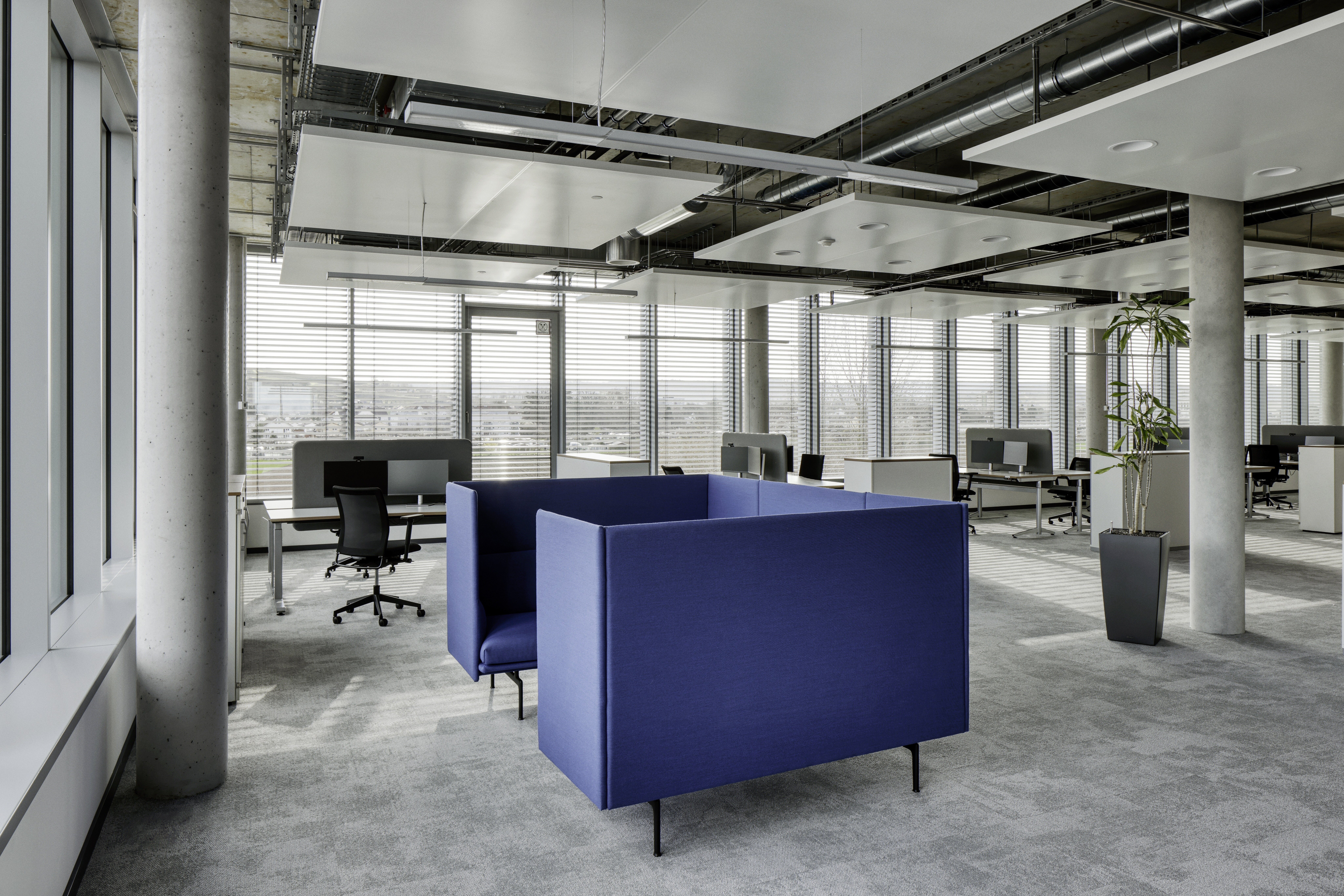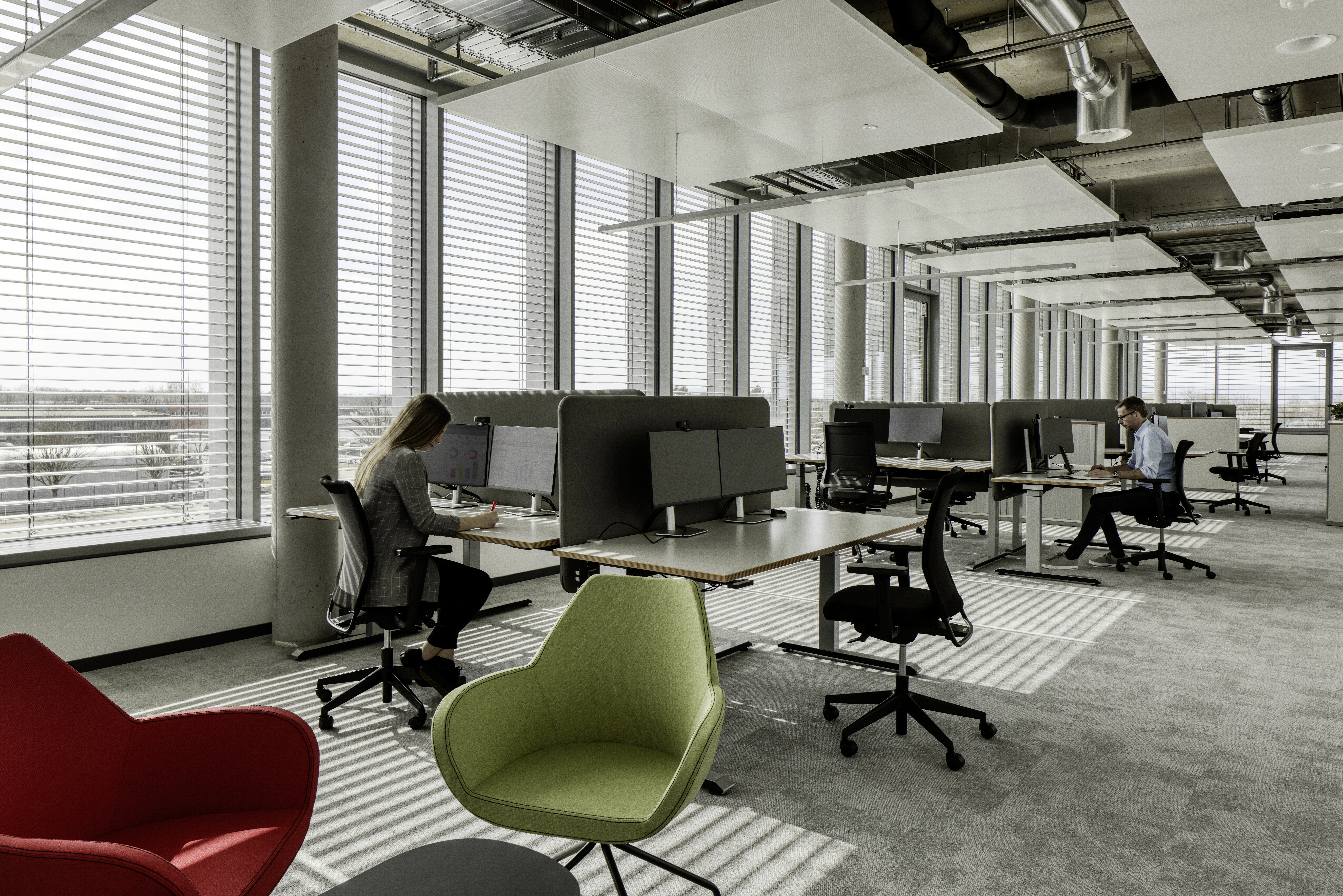 Im Center of Climate wird „Raum“ erfolgreich als eine strategische Ressource begriffen. Jede Abteilung besitzt eine eigene Homebase, jedoch kann man sich überall flexibel einbuchen, um die kollegiale Umgebung passend zum jeweiligen Projekt auszuwählen. Für maximalen Komfort sind die Arbeitsplätze mittels höhenverstellbarer Schreibtische und ergonomischer Stühle gesundheitsfördernd gestaltet. Jeder Arbeitsplatz ist mit zwei Monitoren und einer Headset Dockingstation ausgestattet. Die Meetingräume zusätzlich noch mit Videokonferenzsystemen und interaktiven Displays.