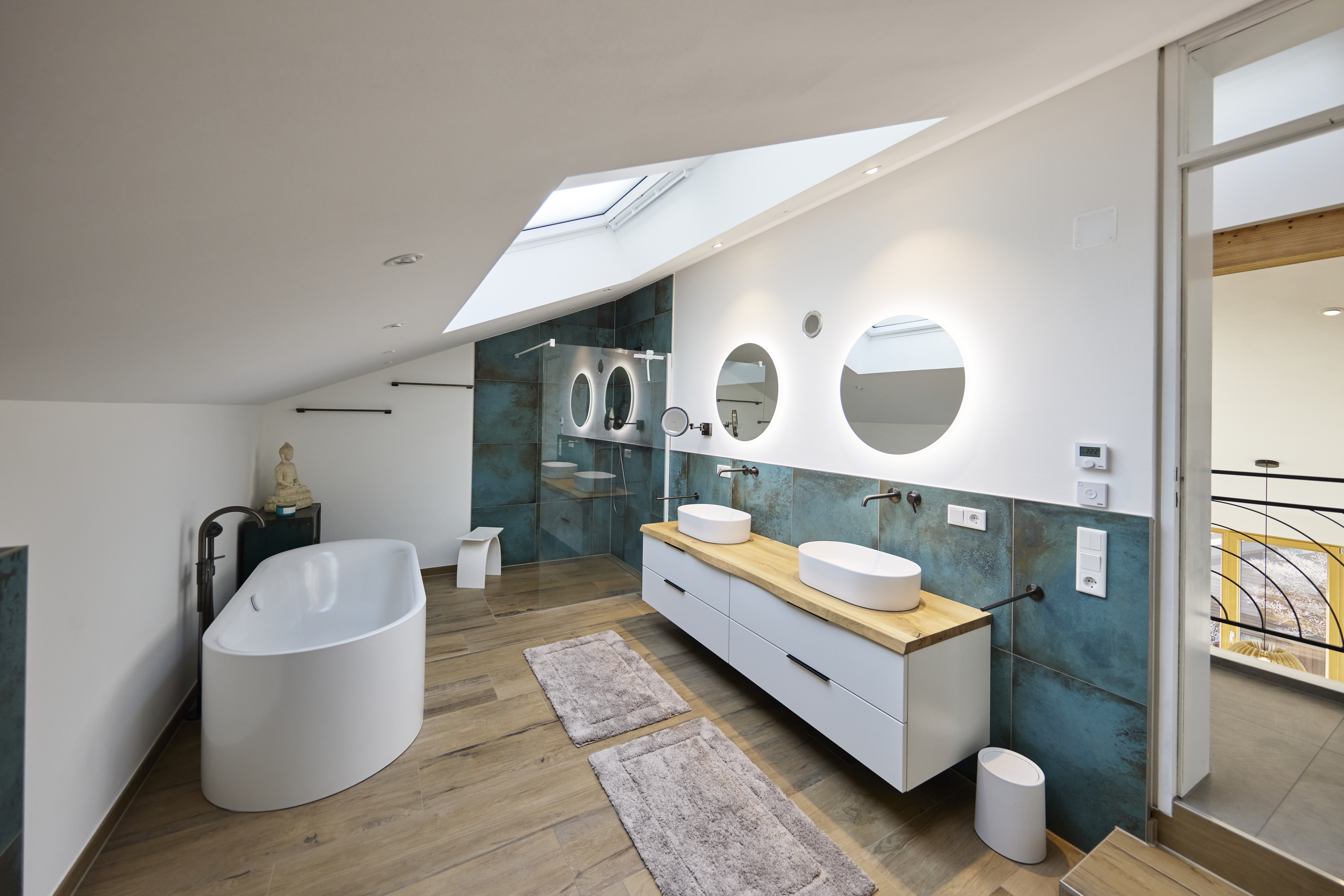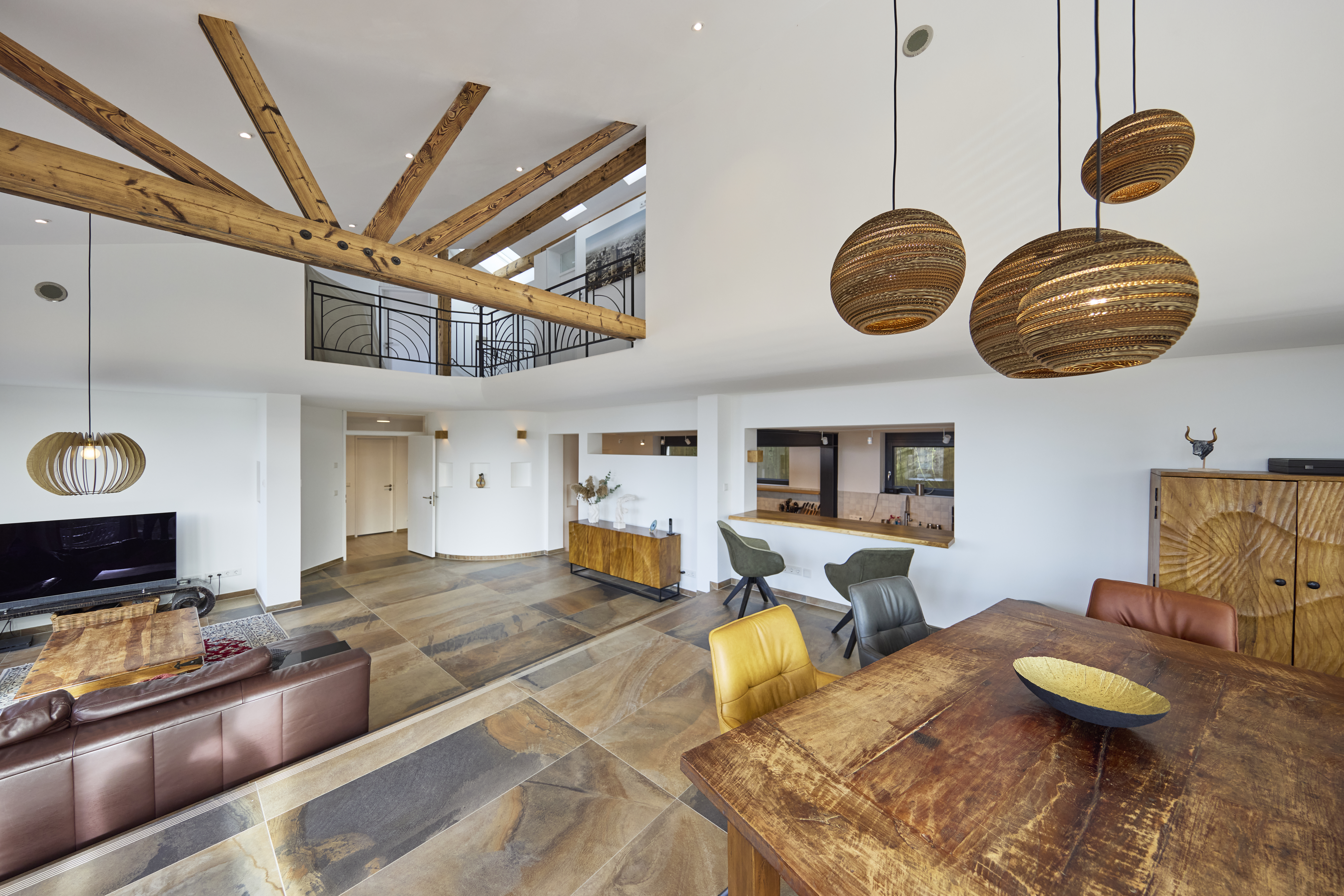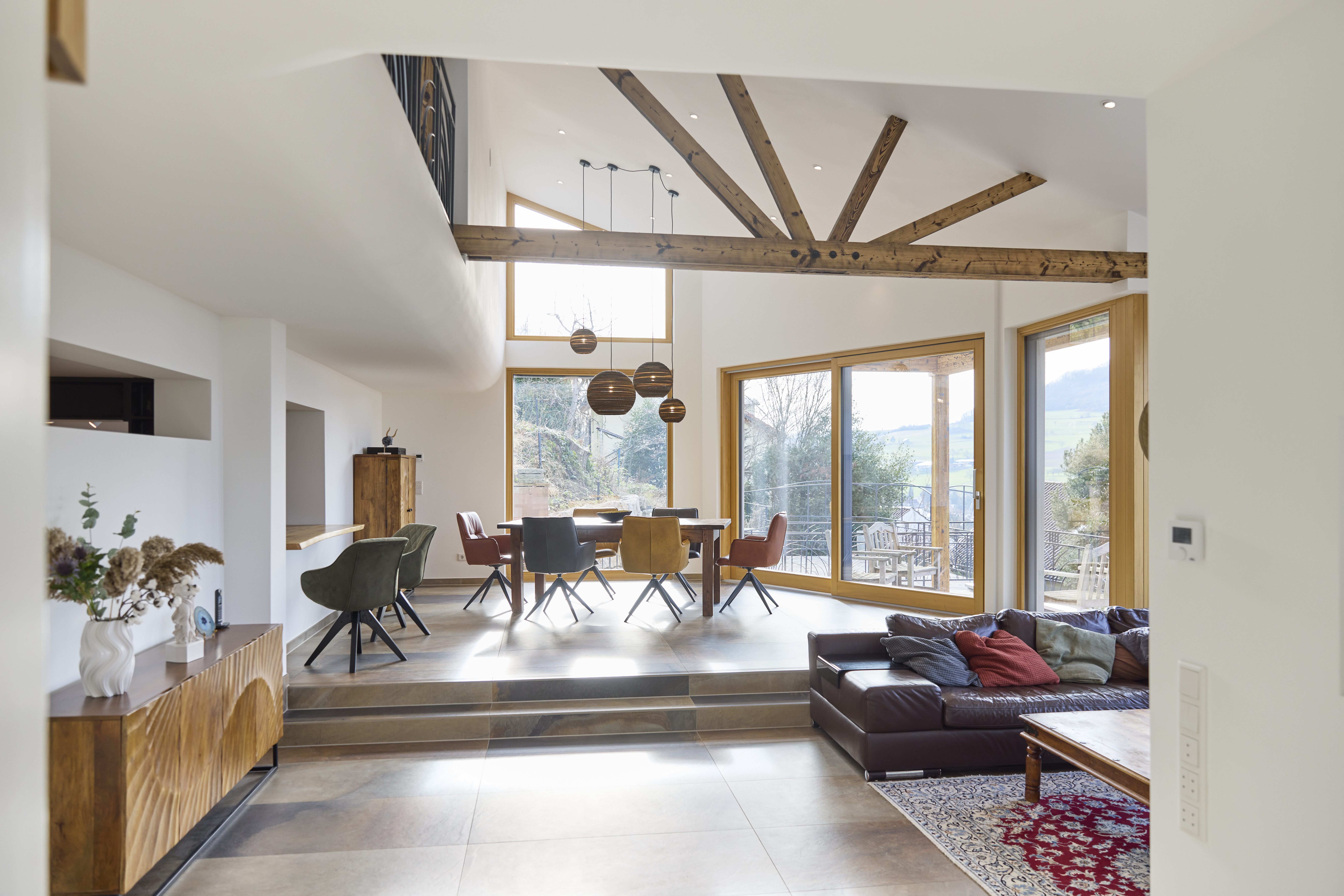 „Wir haben das Haus vollständig entkernt, also bis auf die tragenden Wände zurückgebaut und dann alles neu gemacht. Um sich die Dimensionen besser vorstellen zu können: Insgesamt wurden dabei sage und schreibe 24 Tonnen an Material und Bauschutt aus dem Haus entfernt“, beschreibt Papadakis diesen beeindruckenden Kraftaufwand. Das Ziel: Ein zukunftsfähiges Zuhause im Effizienzhaus-55-Standard, in dem man guten Gewissens alt werden kann. Die Planung übernahm der Bauherr selbst, die Ausführung erfolgte in Zusammenarbeit mit erfahrenen Handwerksbetrieben aus der Region. Heute versorgt eine leistungsstarke Sole-Wasser-Wärmepumpe die rund 275 m² Wohnfläche mit wohliger Wärme – verteilt über eine flächendeckend installierte Fußbodenheizung, die im Sommer sogar zur passiven Kühlung verwendet wird. Dafür nutzt die Wärmepumpe das Erdreich, um dessen Kühle ins Haus zu transportieren. Für nachhaltigen und hausgemachten Strom sorgt eine große Photovoltaikanlage auf dem Dach, die eine Leistung von knapp 10 kWp erzielt.