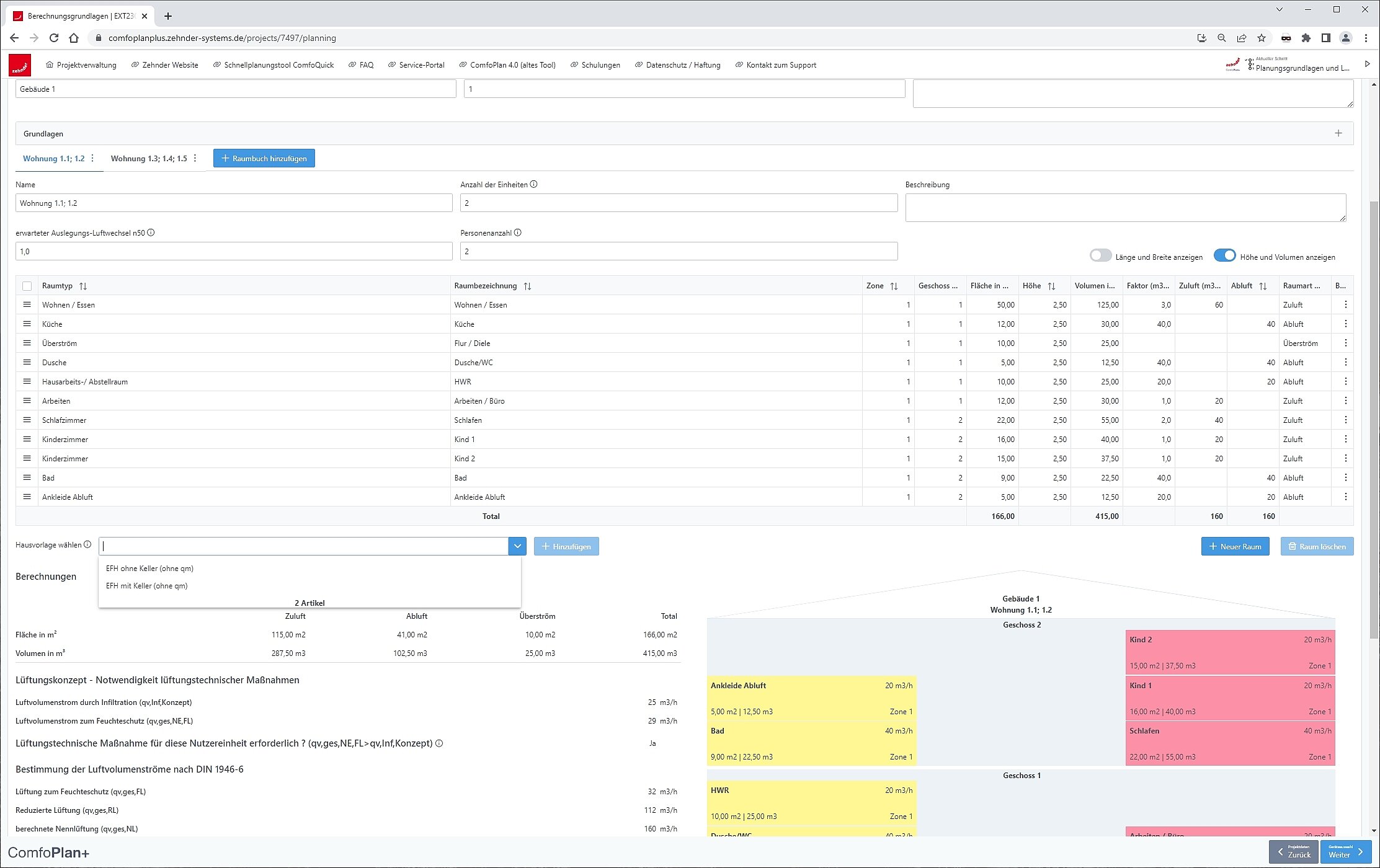 Zehnder ComfoPlan+ ermöglicht die effiziente Erstellung eines Lüftungskonzepts gemäß der Lüftungsnorm DIN 1946-6 in nur wenigen Schritten: Nach Eingabe der Gebäudedaten werden die benötigten Luftmengen berechnet und die Software schlägt anhand dieser Daten selbstständig das passende Komfort-Lüftungsgerät von Zehnder vor. Auf Basis dieser Berechnung lässt sich in wenigen Schritten die optimale Auslegung der Luftverteilung vornehmen. Die nach DIN 1946-6 errechneten Luftmengen können gegebenenfalls nachträglich noch manuell angepasst werden. Zusammen mit den notwenigen Innen- und Außenanschlüssen erhalten Nutzer in kürzester Zeit eine komplette, individuelle Materialliste. So können Bestellungen schnell und einfach veranlasst werden. Das fertige Lüftungskonzept lässt sich beispielsweise als ansprechendes PDF-Dokument exportieren und kann so dem Kunden überzeugend und anschaulich präsentiert werden.
