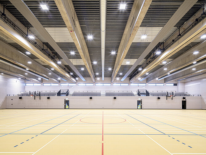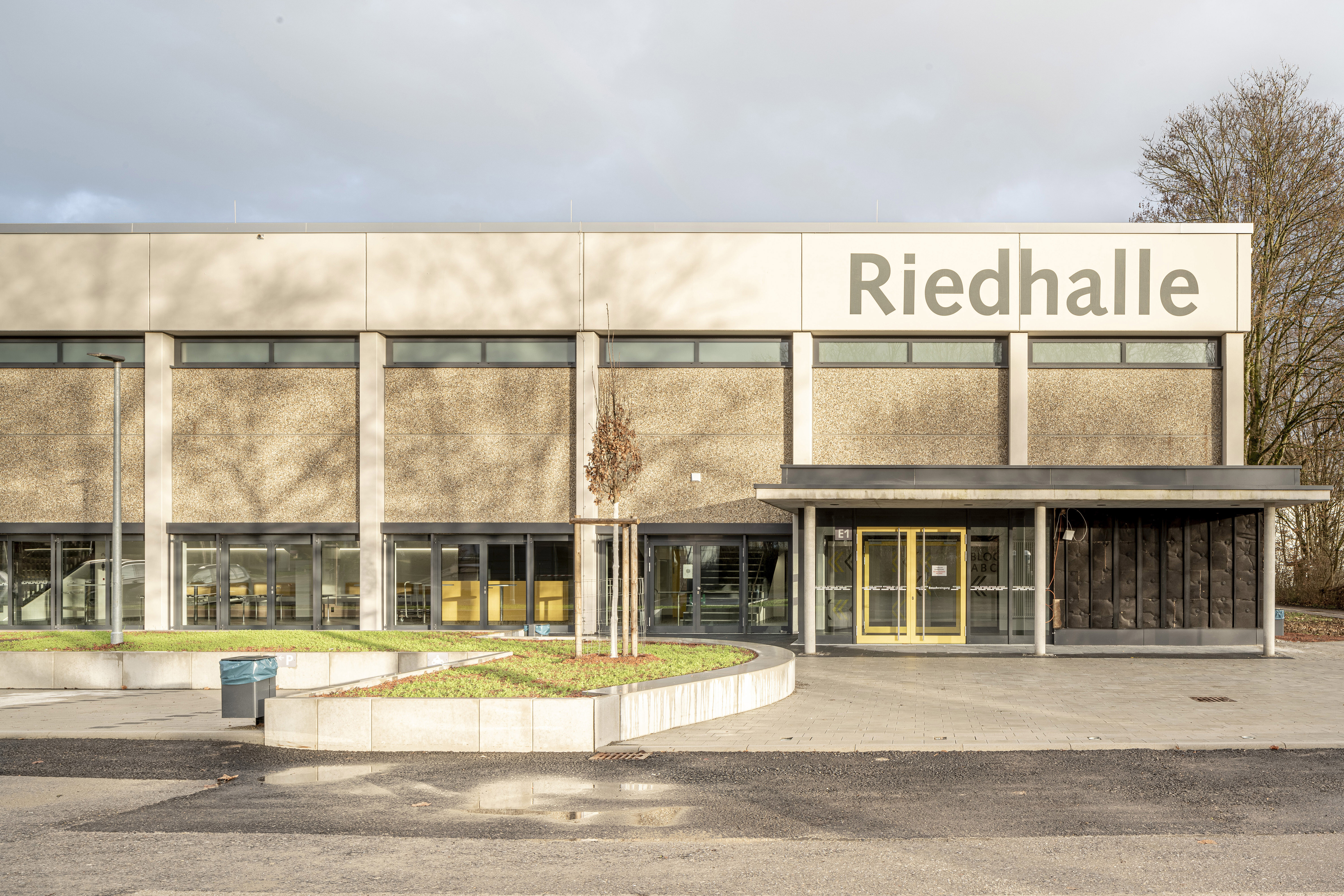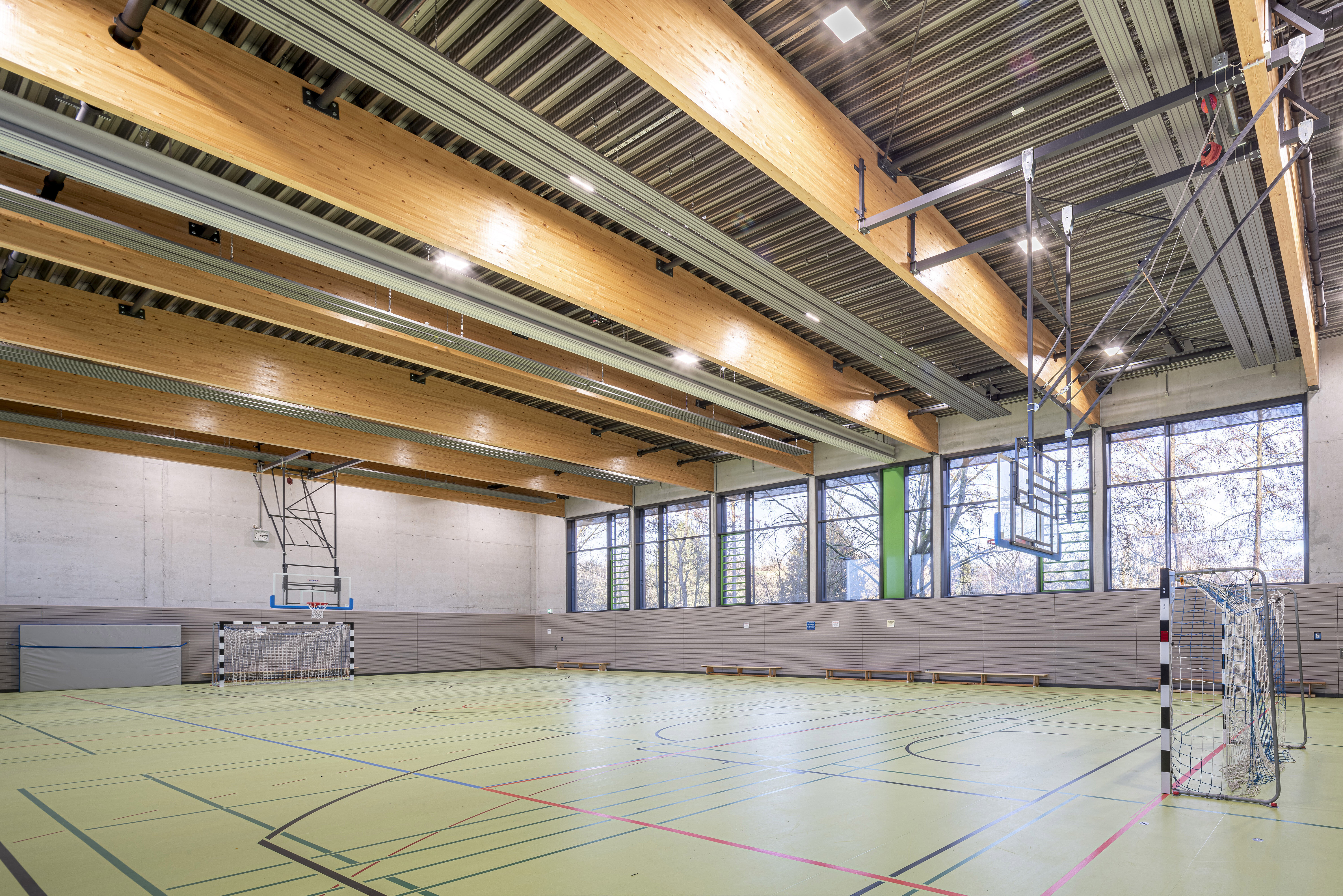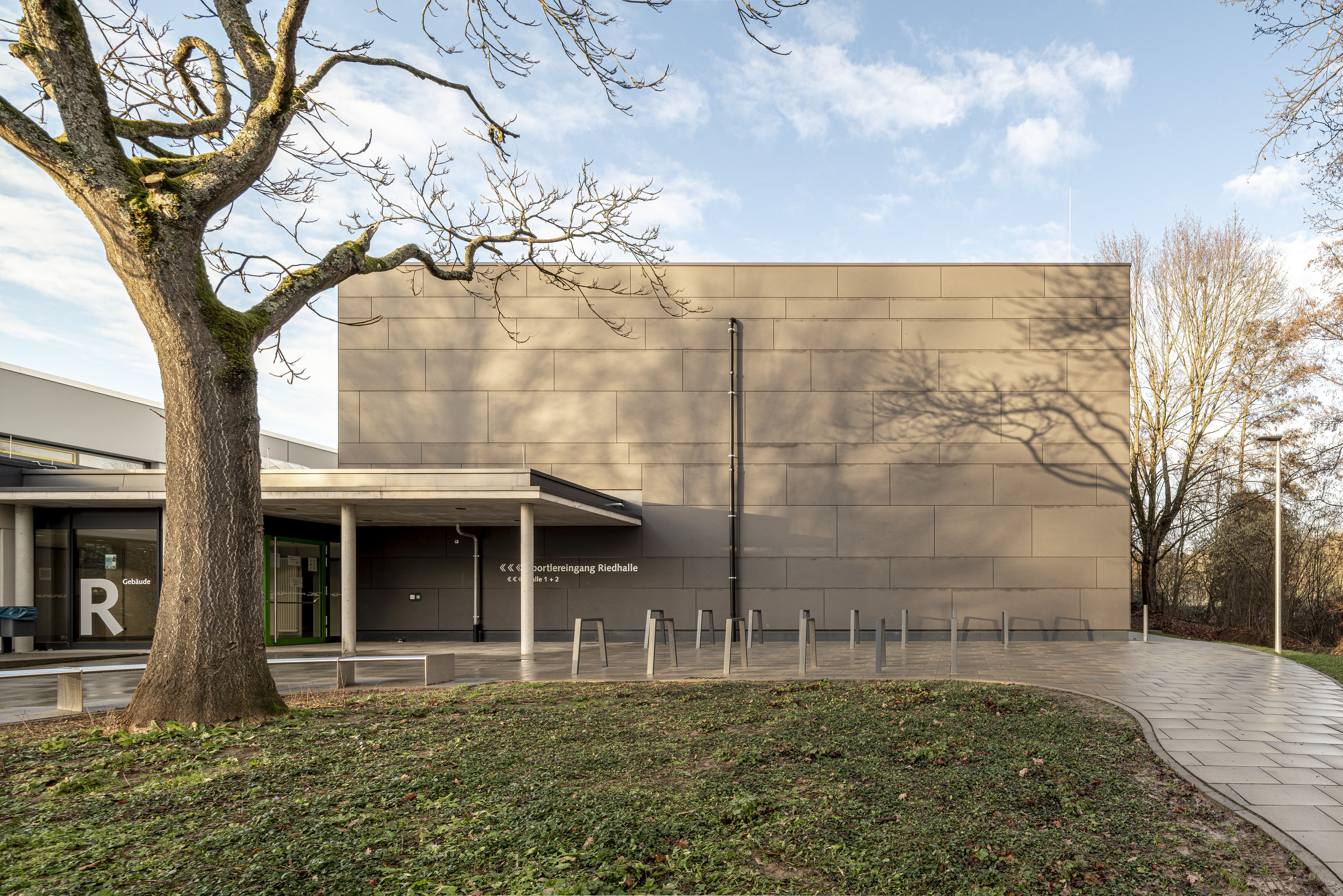 Was passiert, wenn man eine alte Sporthalle zusammen mit begeisterten Sportlerinnen und Sportlern aus drei Schulen und drei Sportvereinen in einen Topf wirft? Richtig: Eine Konstellation, die nicht lange gut gehen kann. Genauso trug es sich im baden-württembergischen Steinheim an der Murr zu, dessen Riedhalle aus dem Jahr 1972 nach knapp 50 Jahren intensiver Benutzung nicht nur marode geworden war, sondern noch dazu aus allen Nähten platzte. Die Belegung vor Ort ist nämlich mehr als dicht. So zählen zum sportlichen Einzugsgebiet nicht nur der Campus mit der Blankensteinschule, der Riedbachschule sowie der Erich-Kästner-Realschule und ihren insgesamt rund 1.100 Schülerinnen und Schülern, sondern auch drei ortsansässige Sportvereine mit zahlreichen Mannschaften in unterschiedlichsten Sportarten wie Fußball, Handball, Volleyball, Leichtathletik und vielem mehr. Um die zahllosen Sportbegeisterten aus Steinheim und Umgebung gebührend zu versorgen, entschied sich die zwischen Stuttgart und Heilbronn gelegene Stadt für eine zweiteilige Lösung. Wichtig war dabei einerseits, eine moderne und langlebige Sportstätte zu schaffen, aber andererseits auch möglichst nachhaltig und ressourcenbewusst zu handeln, wie sich der zuständige Planer Frank Müller von der Ratioplan GmbH erinnert: „Natürlich wurde darüber nachgedacht, die alte Sporthalle komplett abzureißen und dafür eine größere, moderne Halle an Ort und Stelle zu errichten. Ich selbst bin aus Gründen der Nachhaltigkeit allerdings stets für eine Sanierung, sofern dies möglich ist.“