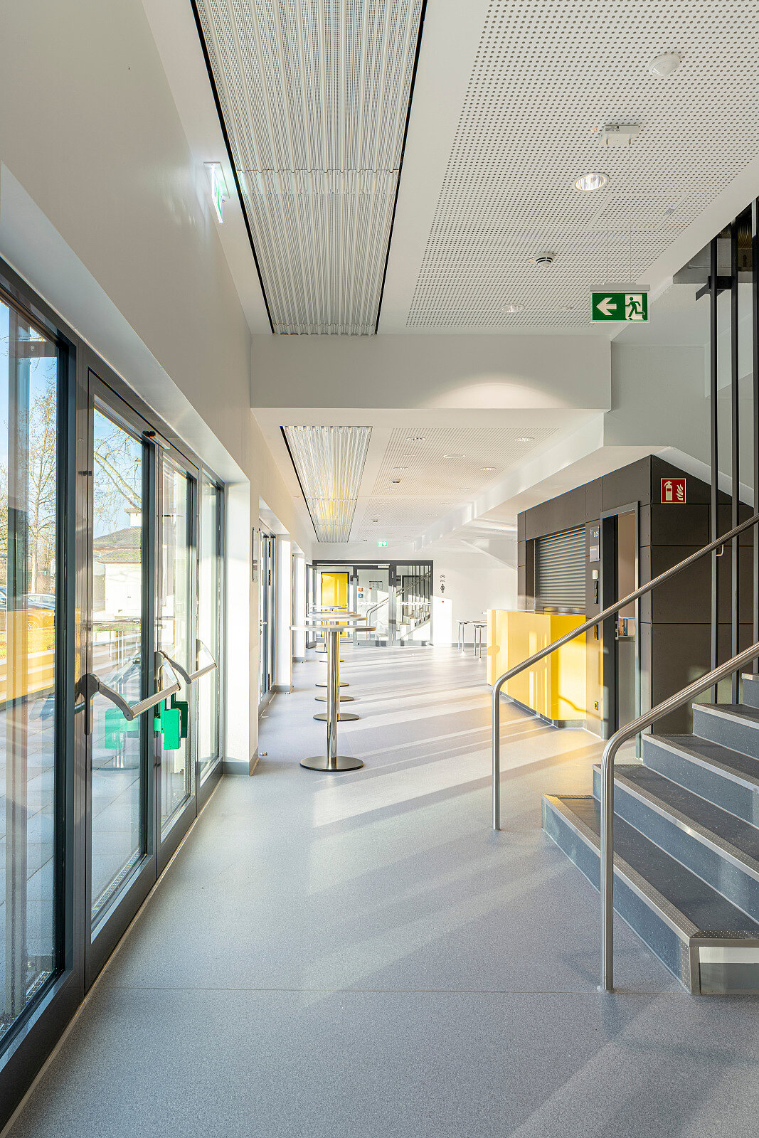 Die Einbringung der Deckenstrahlplatten gestaltete sich außerordentlich schnell und unkompliziert. In den Hallen war die Montage nach jeweils weniger als einer Woche abgeschlossen, im Foyer betrug der Aufwand 2-3 Tage. Zehnder Deckenstrahlplatten sind geprüft ballwurfsicher und wurden in Steinheim zusätzlich mit Ballabweisgittern ausgestattet. „So können wir die äußerst lange Lebenszeit unserer Deckenstrahlplatten auch bei ‚starkem Beschuss‘ garantieren“, berichtet Tino Göckeritz stolz. Zur Verbesserung der Hallenakustik wurde in der sanierten Halle auf die gelochte Version der Deckenstrahlplatten Zehnder ZFP zurückgegriffen. Diese absorbiert einen nicht unerheblichen Teil der auftretenden Geräusche und sorgt so für zusätzlichen Komfort. Auch den optischen Vorlieben des Bauherrn konnte Zehnder mit seinen Deckenstrahlplatten exakt nachkommen. Während das Heizsystem im sanierten Foyer in klassischem Verkehrsweiß (RAL 9016) erstrahlt, griff man über den Sportflächen zu dezentem Graualuminium (RAL 9007).