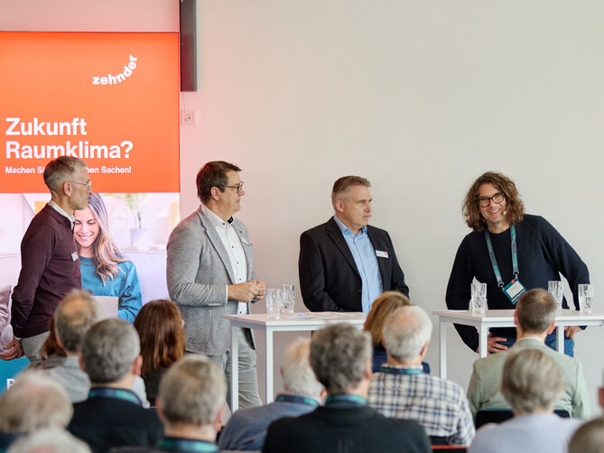 Im darauffolgenden Zehnder Talk diskutierten Arnulf Gödde, Oliver Geithe, Leiter Zehnder Solution-Management Heizkörper und Lüftung sowie Heiko Braun, Zehnder Director Business Development, und Michael Kölmel über die Zukunft des Raumklimas. Einigkeit bestand darin, dass der größte Hebel in integrierten Systemlösungen für Heizen, Kühlen und Lüften liegt – im Neubau ebenso wie in der Modernisierung. Gerade im Geschosswohnungsbau erkennen die Experten hier ein enormes Potenzial. Gödde betonte in diesem Zusammenhang die besondere Bedeutung der Zielgruppe Fachplaner für die Transformation des Gebäudebestands: „Sie wählen Technologien, setzen Standards – und damit den Kurs für zukunftsfähige Gebäude“. Zehnder bietet bereits heute entsprechende Lösungen an und unterstützt Planer intensiv in Konzeption und Umsetzung. Geräte, wie die Kühleinheit Zehnder ComfoClime Cool, die in den immer heißer werdenden Sommermonaten für angenehm vorgekühlte Zuluft in Gebäuden sorgen, gewinnen stetig an Bedeutung.