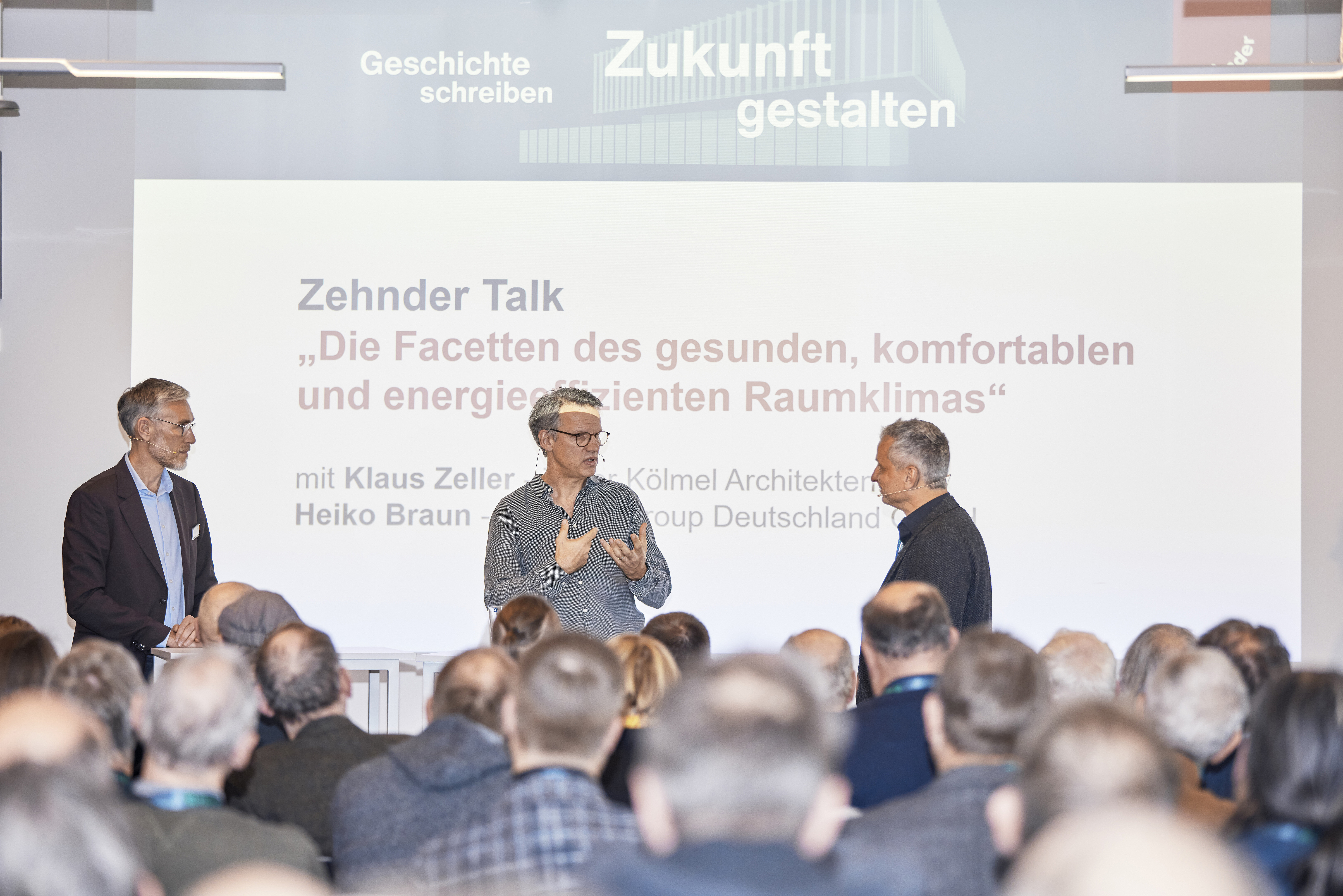 Für den intra- und interdisziplinären Austausch sorgten die beiden Vorträge von Simone Alexia Saiegh (dena) und Klaus Zeller (Zeller Kölmel Architekten, Köln) sowie der anschließende Talk zusammen mit Zehnder Geschäftsführer Heiko Braun. Im Mittelpunkt stand dabei die serielle Sanierung nach dem Energiesprong-Prinzip. Hier wurden in spannender Expertenkonstellation die Ziele und Chancen des Energiesprong-Ansatzes diskutiert, wobei nicht nur die Sicht des deutschen Mitinitiators dena, sondern auch der Architekten- und der Herstellerseite beleuchtet wurde. Zehnder konnte mit seinem neuen Komfort-Lüftungsgerät Zehnder ComfoAir Fit 100 und dem Wärmepumpen-Heizkörper Zehnder Nova Neo etwa in einem seriellen Sanierungsprojekt nach dem Energiesprong-Prinzip bereits einen effektiven Beitrag zur Erreichung des Energieeffizienzstandards 40 EE leisten.