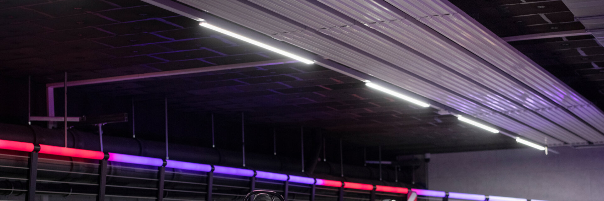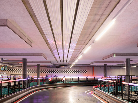 Die einzelnen Elemente der Zehnder Deckenstrahlplatten fügen sich perfekt in das optische Gesamtkonzept der Halle ein und verleihen der Rennbahn einen urbanen Style.