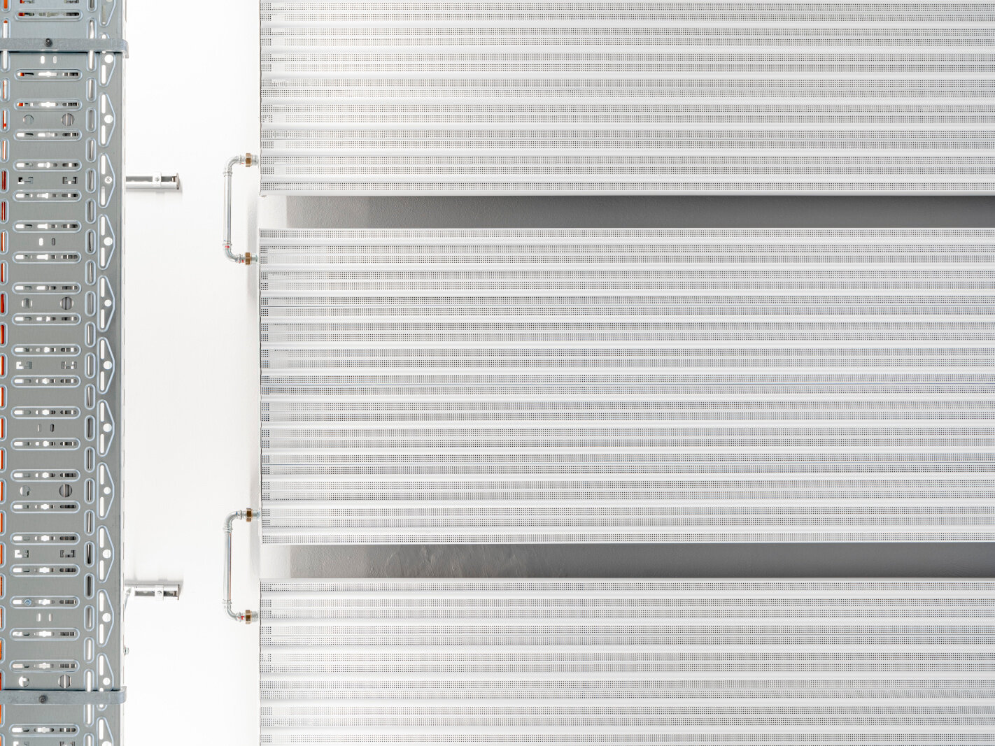 Die Deckenstrahlplatten werden nach dem Baukastenprinzip exakt angepasst. So können unterschiedliche Eigenschaften und Komponenten, wie LED-Leuchten und Ballabweisgitter, kombiniert werden.