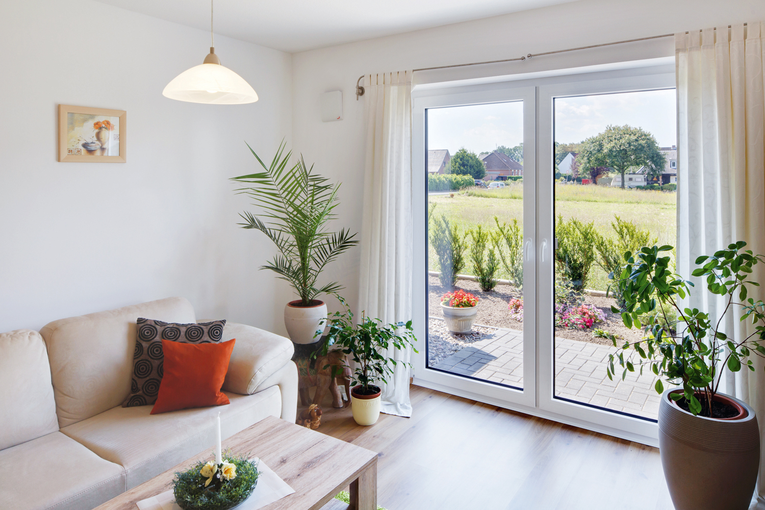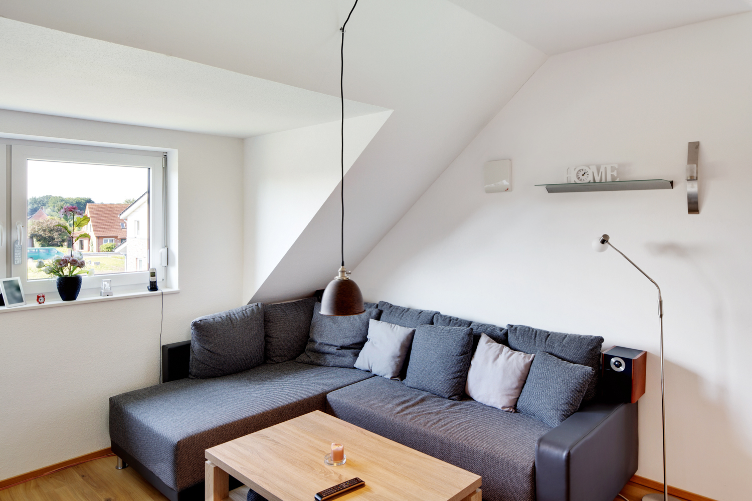 Mit seinem flachen und unauffälligen Design fügt sich das Lüftungsgerät Zehnder ComfoSpot Twin40 unauffällig in das Wohnzimmer der gnarrenburger Parterre-Wohnungen ein.