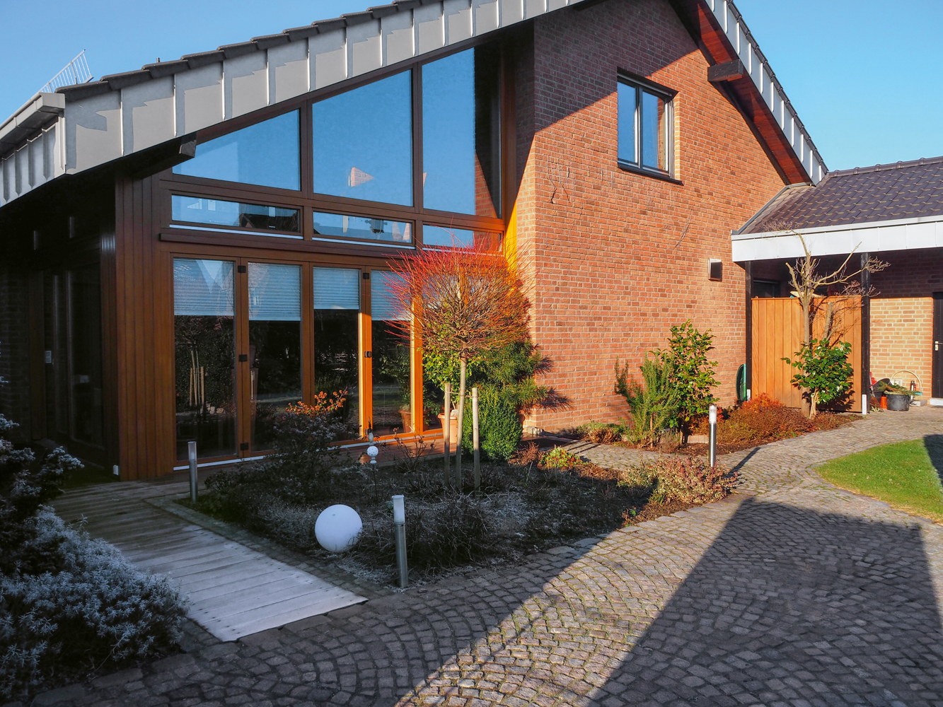 Das Schlafzimmer im Erdgeschoss rechts wurde ursprünglich durch die Terrassentür mit frischer Außenluft versorgt. Seit der Umgestaltung der Veranda zum Wintergarten war dies nicht mehr möglich. Nach einem minimalen Eingriff in den Baukörper sorgt nun ein unauffälliges dezentrales Komfort-Lüftungsgerät mit Enthalpietauscher energieeffizient für optimales Raumklima (links neben dem Vordach).