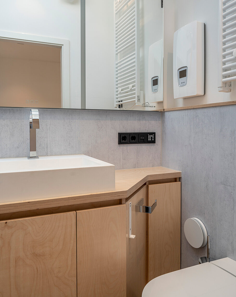Das dezentrale Komfort-Lüftungsgerät Zehnder ComfoAir 70 transportiert verbrauchte Luft, wie hier im Badezimmer, ab und leitet reine Luft ein. So entsteht ein gesunder und hygienischer Luftwechsel im Tiny House.