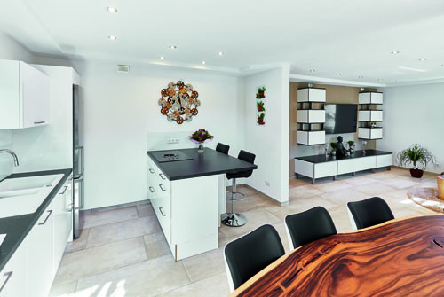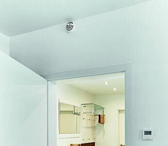 Im Wohnbereich sind von der intelligenten Haustechnik nur die unauffälligen Zehnder Renovationsventile zu sehen. Die frische Zuluft strömt ins Wohnzimmer, verteilt sich optimal im Raum und wird im Küchenbereich als verbrauchte, warme und feuchte Abluft wieder abgeführt. So profitieren die Bewohner immer von maximalem Wohnkomfort.