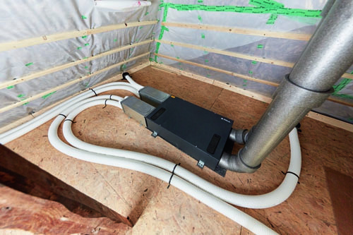 Auf dem Dachboden wurden die Luftleitungen für das Dachgeschoss verlegt. Das Luftdurchlassgehäuse Zehnder TVA-P wird durch die Decke eingesetzt und von der Gegenseite mit einem Ventil versehen. Durch dieses Ventil strömt frische Zuluft in den darunterliegenden Flur.