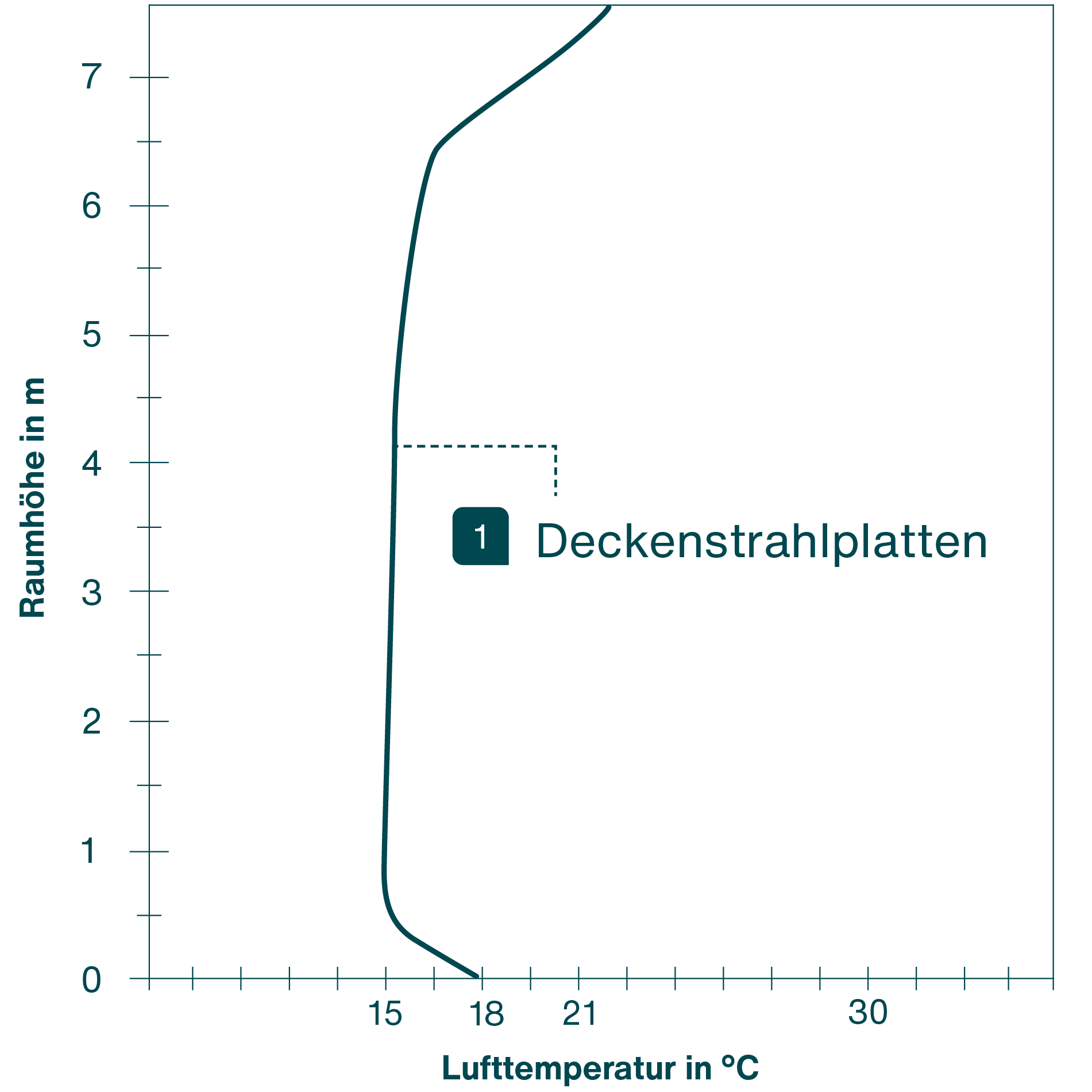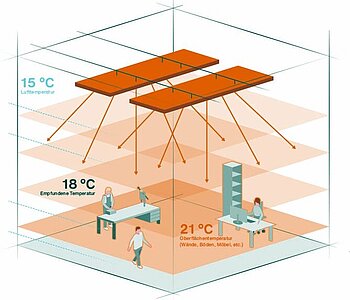Im links dargestellten Diagramm, beheizen Zehnder Deckenstrahlplatten einen beispielhaften Raum mit einer Deckenhöhe von 7 m über das Strahlungsprinzip der Sonne. Mit einem Strahlungsanteil von bis zu 89 % werden dabei effizient und gezielt Personen und Oberflächen im Raum erwärmt.