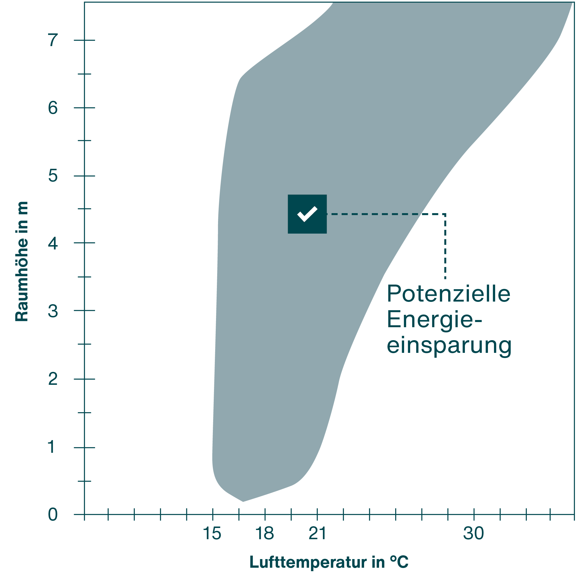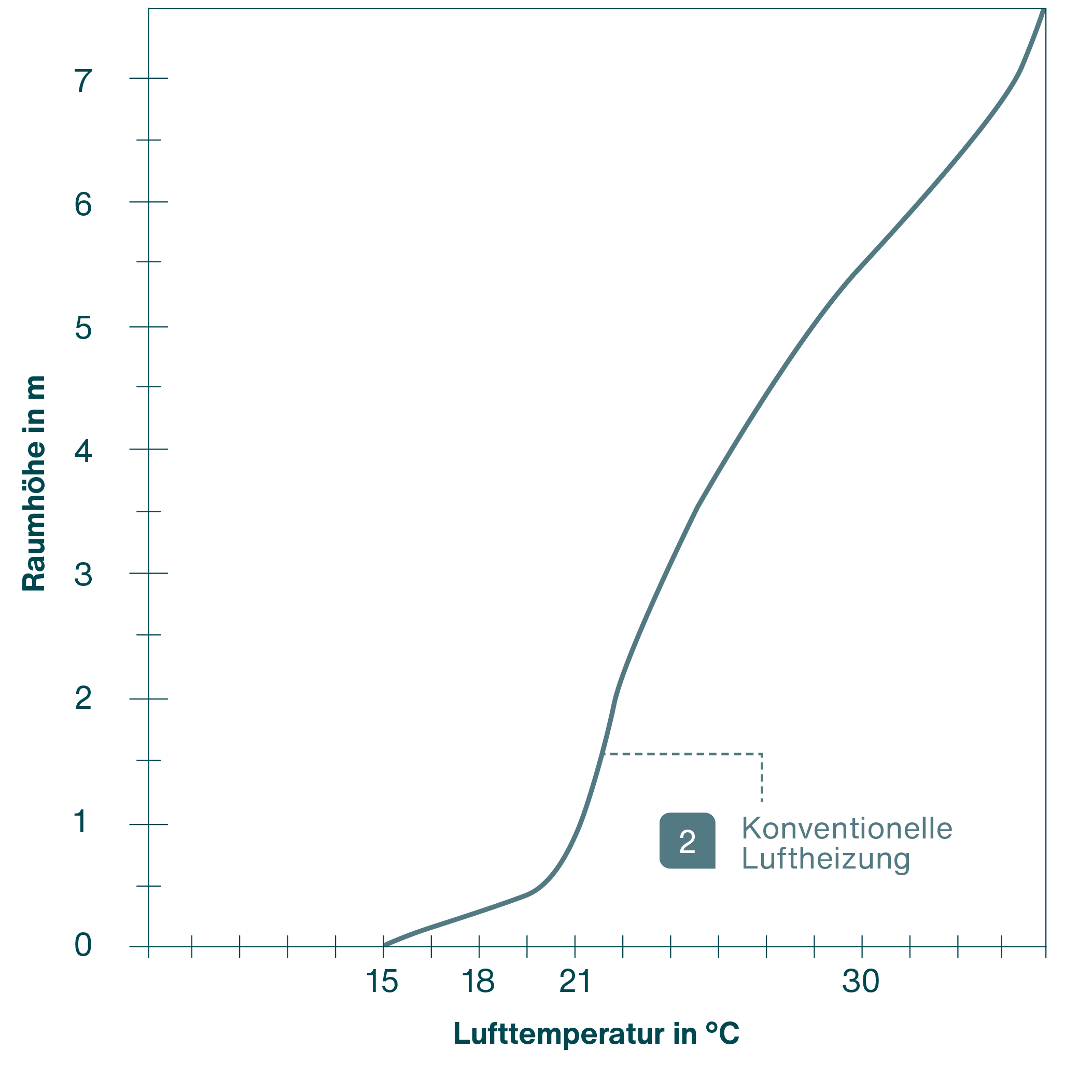 Die Wärme kommt direkt dort an, wo sie gebraucht wird und es entsteht kein Wärmestau unter der Decke. Das Ergebnis ist eine gleichmäßige und angenehme Temperaturverteilung.