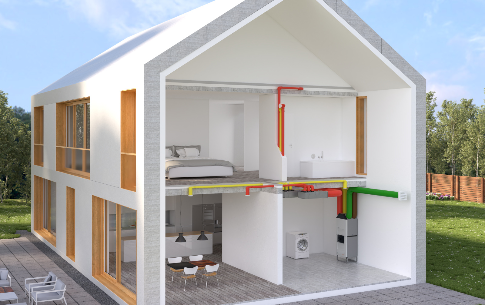 Bei zentralen Belüftungssystemen versorgt ein Lüftungsgerät über ein Luftverteilsystem, die gesamte Wohnfläche im Haus mit frischer Luft. Häufig wird das Lüftungsgerät in Räumen wie dem Technikraum oder im Keller installiert und kann mit einer zentralen Steuerung bedient werden.