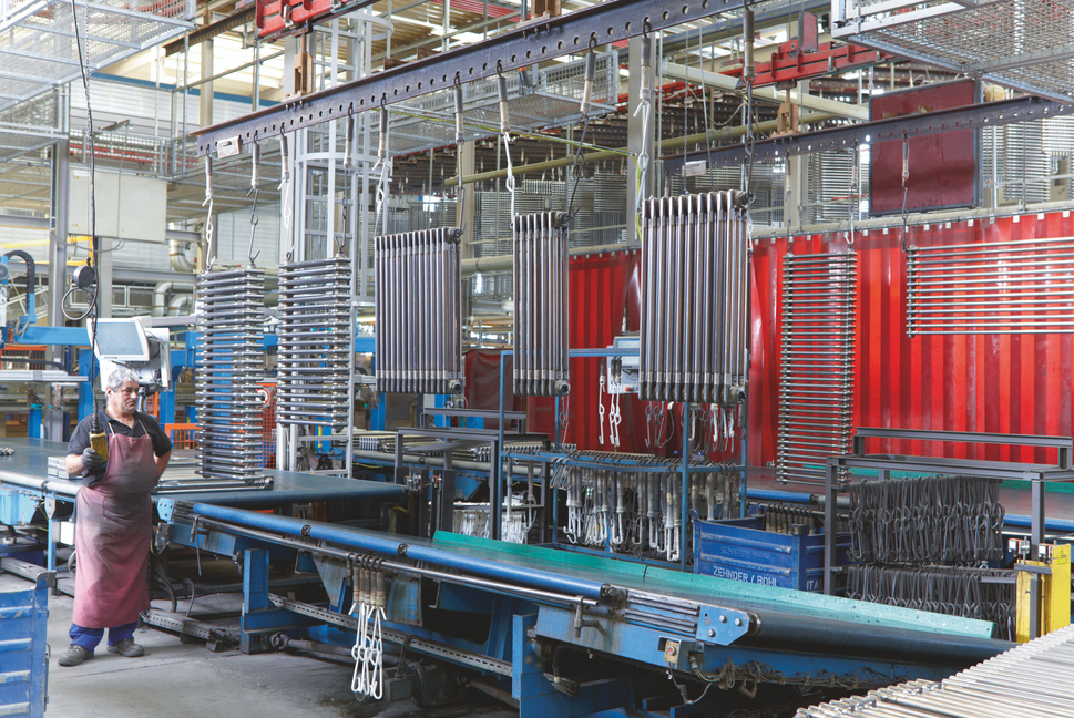 Die geprüften Heizkörper werden nun zur Reinigungsvorbereitung an dem sogenannten Power-and-Free-System aufgehängt. Dieses System besteht aus sechs Kettenkreisen mit ca. 2,5 km Länge. Der Heizkörper bleibt nun bis zur Verpackung an diesem Kettensystem aufgehängt.