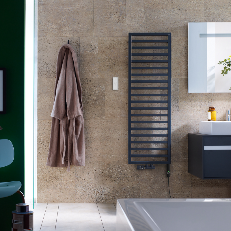 Heizkörper im Mischbetrieb bieten durch separate Anschlüsse für die Warmwasserarmaturen und den elektrischen Heizstab eine saubere Optik. Zudem garantieren sie behagliche Wärme und kuschelig vorgewärmte Handtücher, ohne dass bereits das gesamte Heizsystem laufen muss.